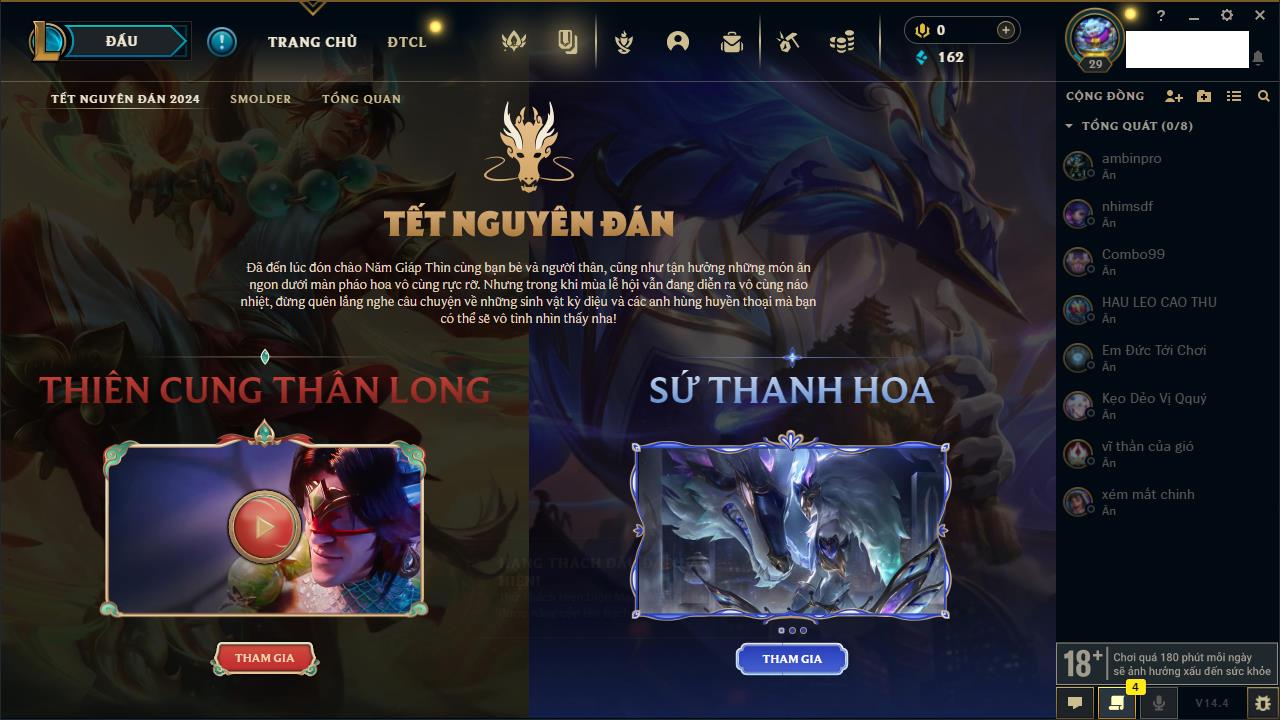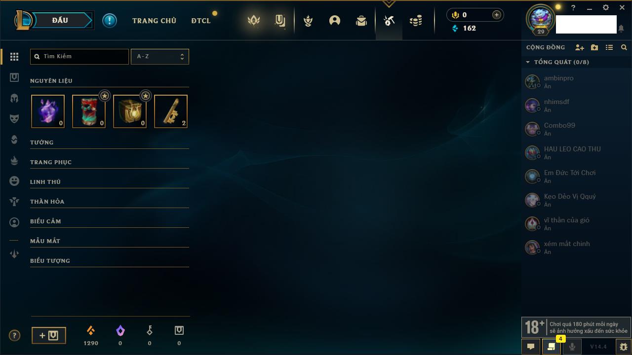 Rank Đơn: Chưa rank mùa nàoKhung: Chưa có khungTướng: 0 - Còn 2000 THXTrang Phục: 0Rank ĐTCL: Chưa rank mùa nàoLinh Thú: 24