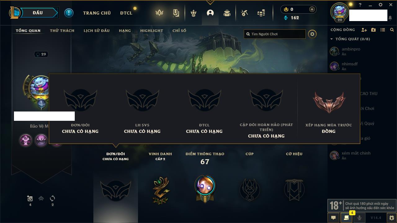 Rank Đơn: Chưa rank mùa nàoKhung: Chưa có khungTướng: 159 - Còn 8539 THXTrang Phục: 28Rank ĐTCL: Chưa rank mùa nàoLinh Thú: 136