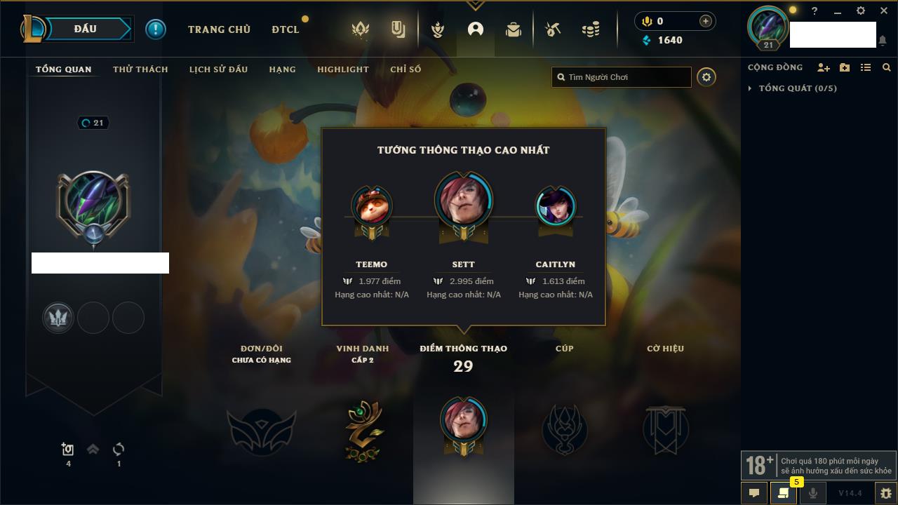 Rank Đơn: Chưa rank mùa nàoKhung: Chưa có khungTướng: 154 - Còn 1660 THXTrang Phục: 6Rank ĐTCL: Chưa RankLinh Thú: 18