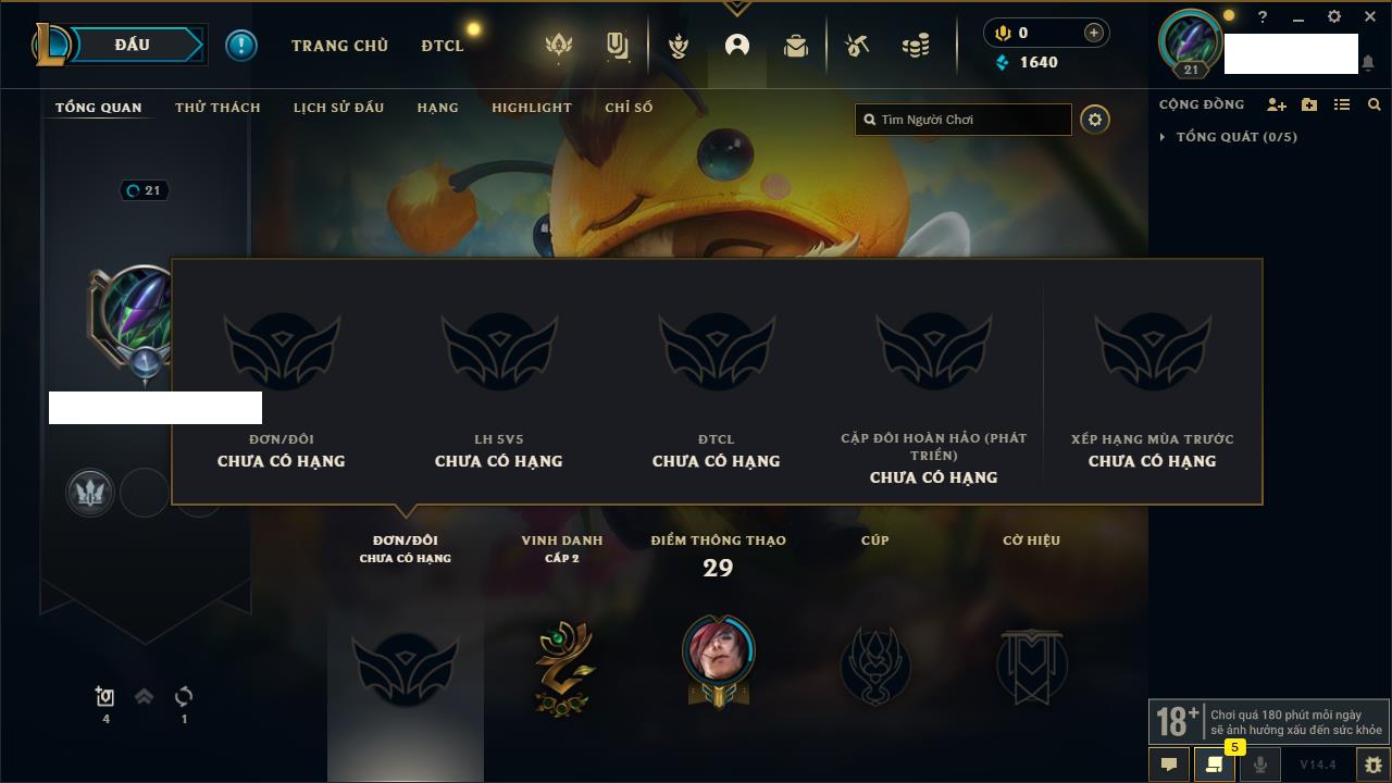 Rank Đơn: Chưa rank mùa nàoKhung: Chưa có khungTướng: 7 - Còn 33750 THXTrang Phục: 0Rank ĐTCL: Bạch Kim ILinh Thú: 25