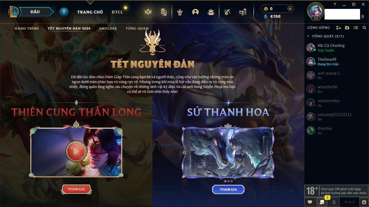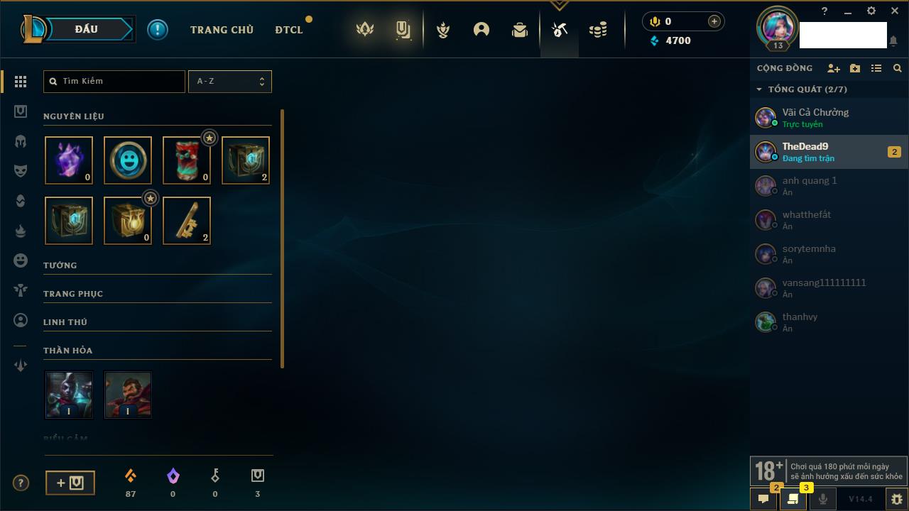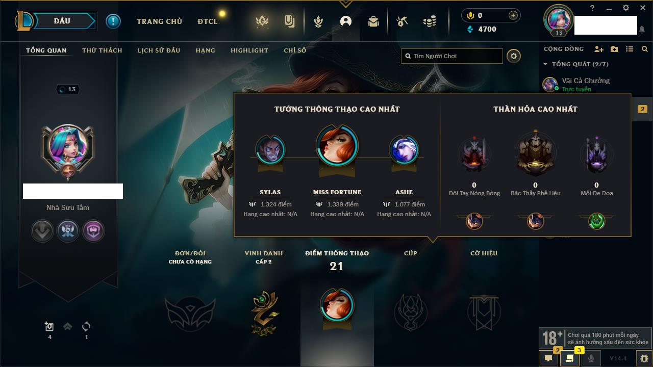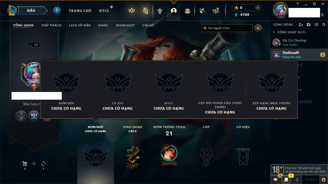 Rank Đơn: Chưa rank mùa nàoKhung: Chưa có khungTướng: 0 - Còn 14550 THXTrang Phục: 0Rank ĐTCL: Chưa RankLinh Thú: 50