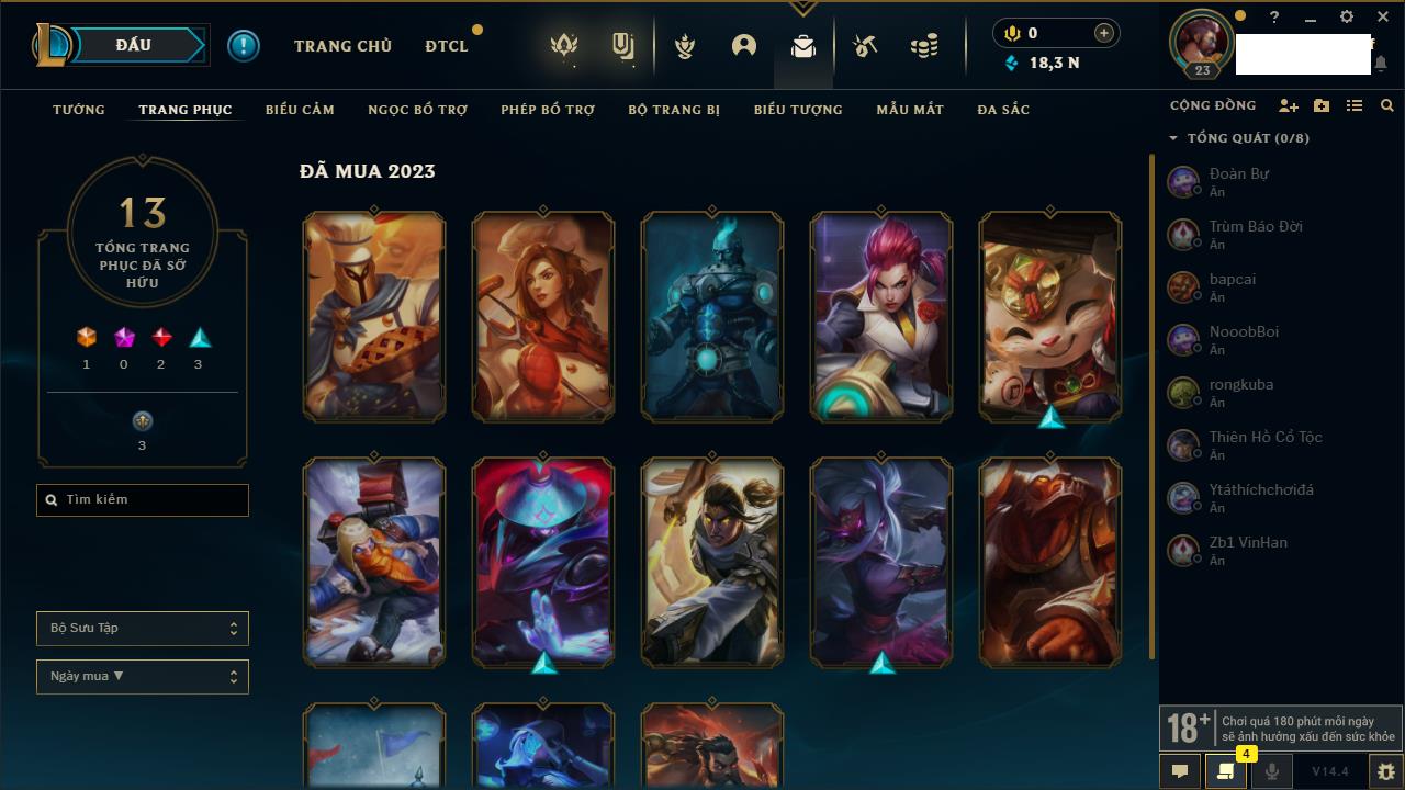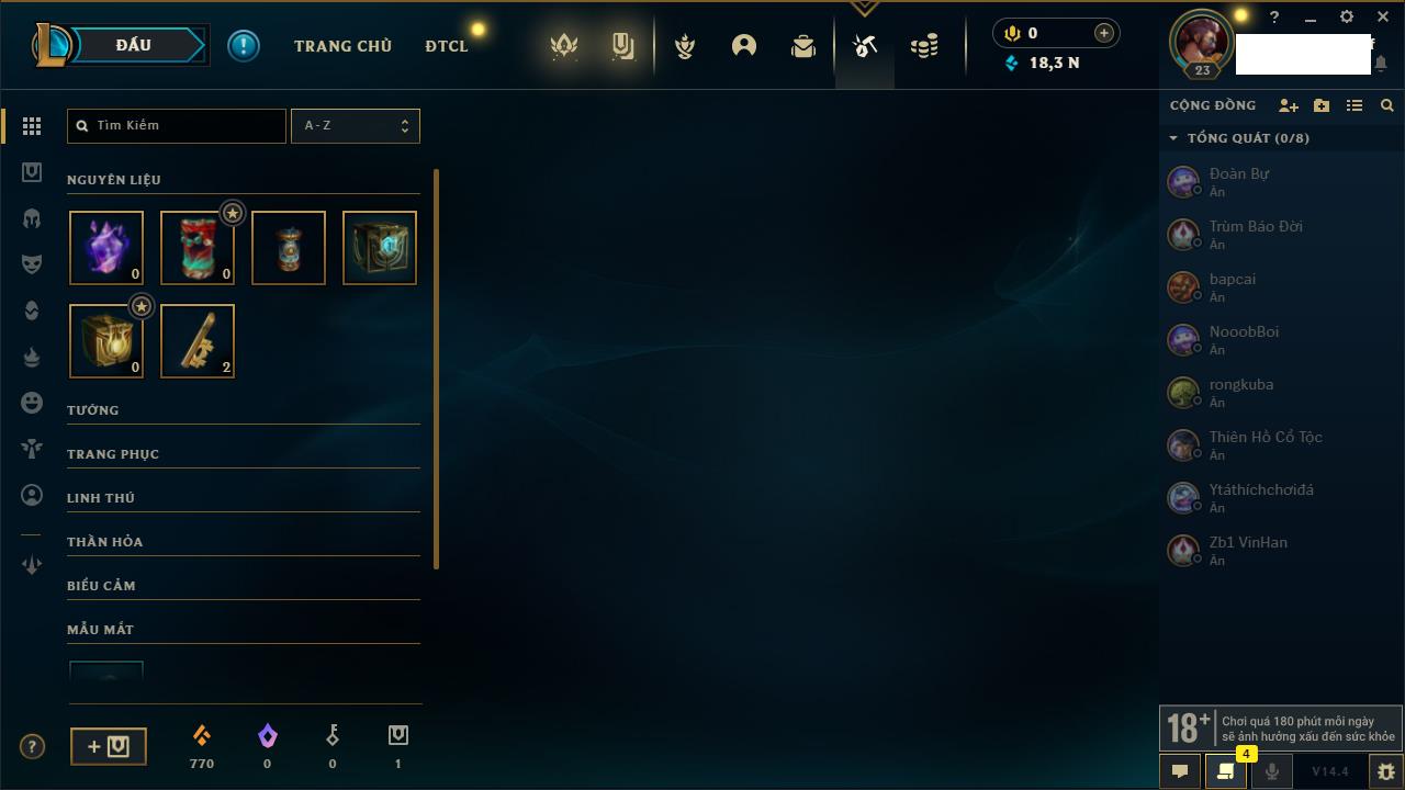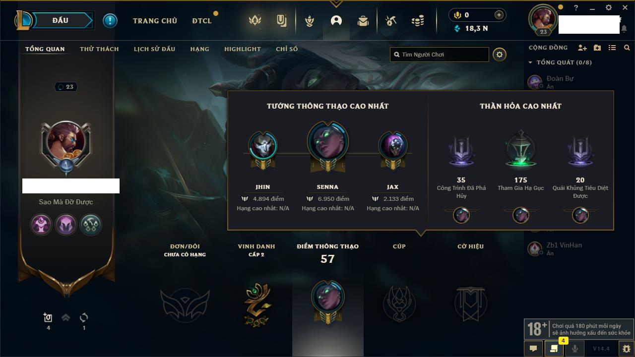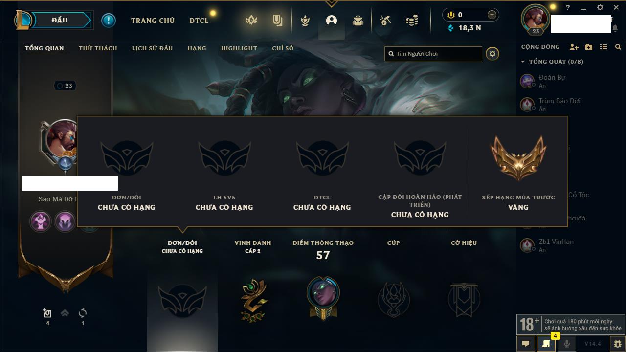 Rank Đơn: Chưa rank mùa nàoKhung: Chưa có khungTướng: 154 - Còn 1660 THXTrang Phục: 6Rank ĐTCL: Chưa RankLinh Thú: 18