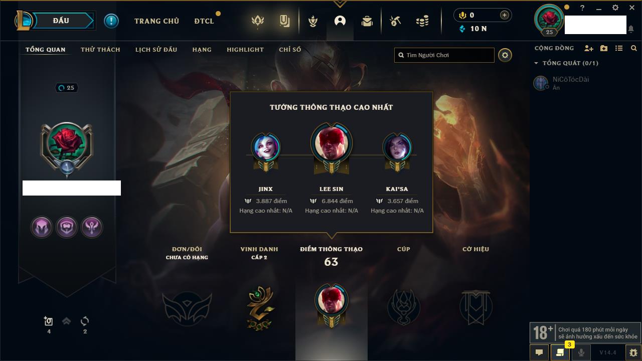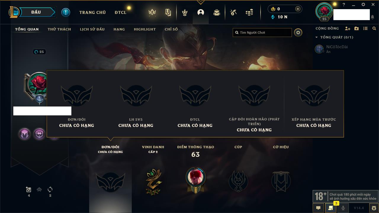 Rank Đơn: Sắt IIIKhung: Chưa có khungTướng: 63 - Còn 185 THXTrang Phục: 8Rank ĐTCL: Chưa RankLinh Thú: 75