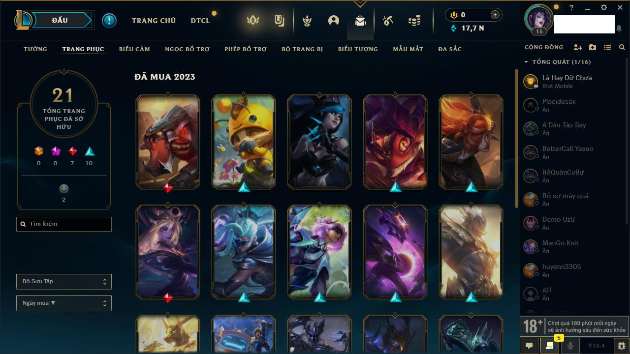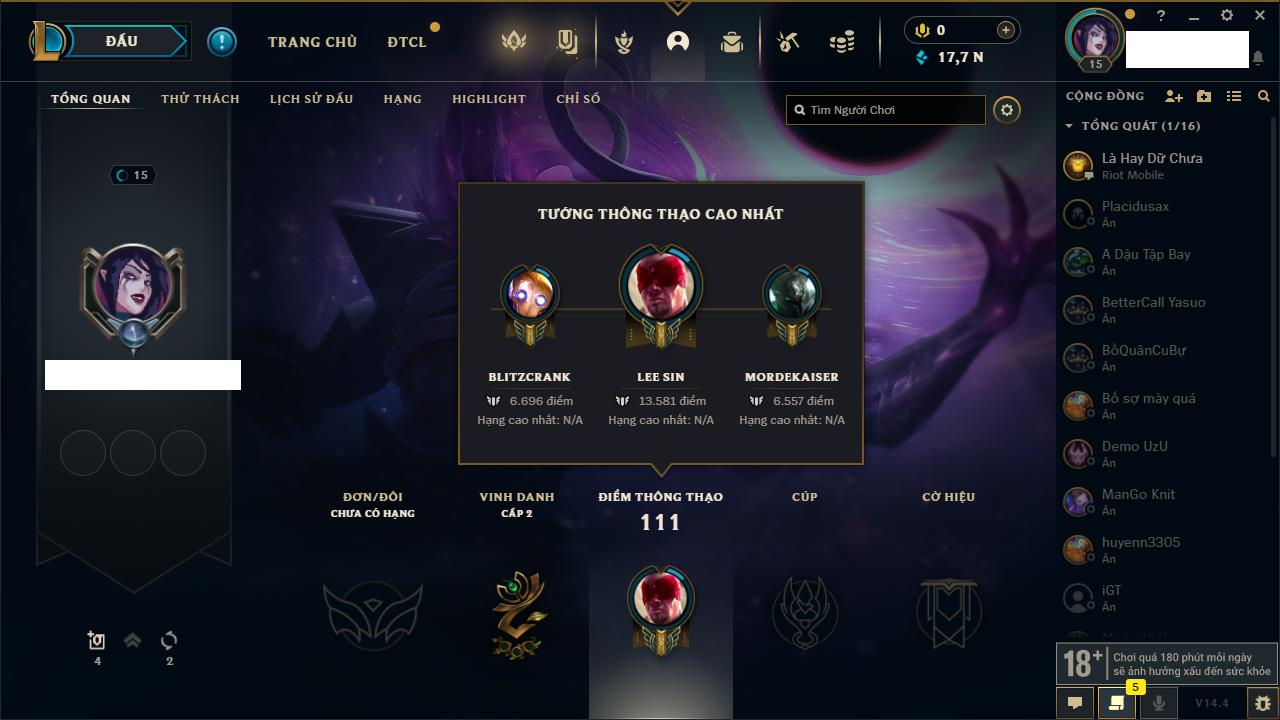 Rank Đơn: Chưa rank mùa nào Khung: Chưa có khung Tướng: 166 - Còn 3090 THX Trang Phục: 9 Rank ĐTCL: Chưa Rank Linh Thú: 125