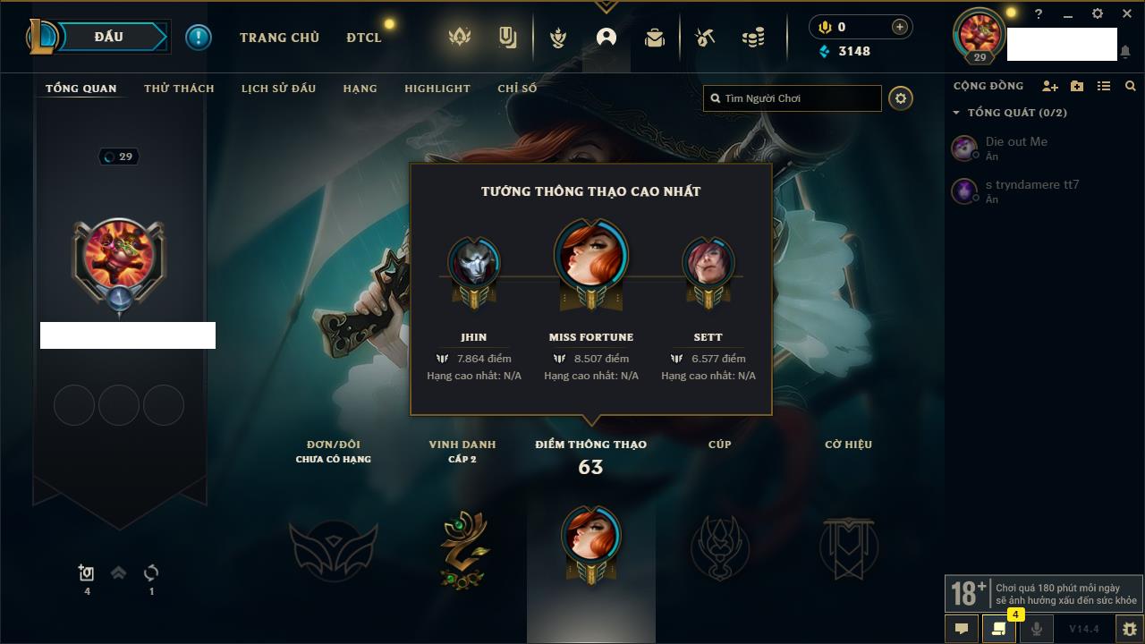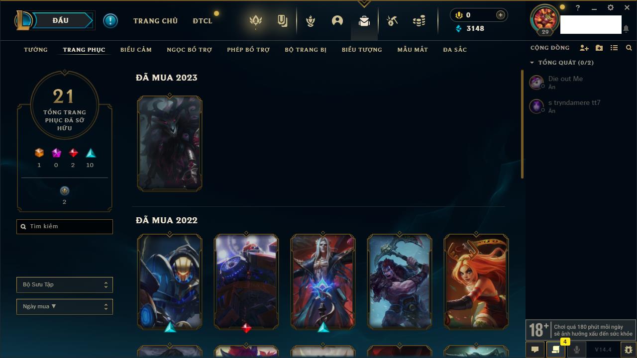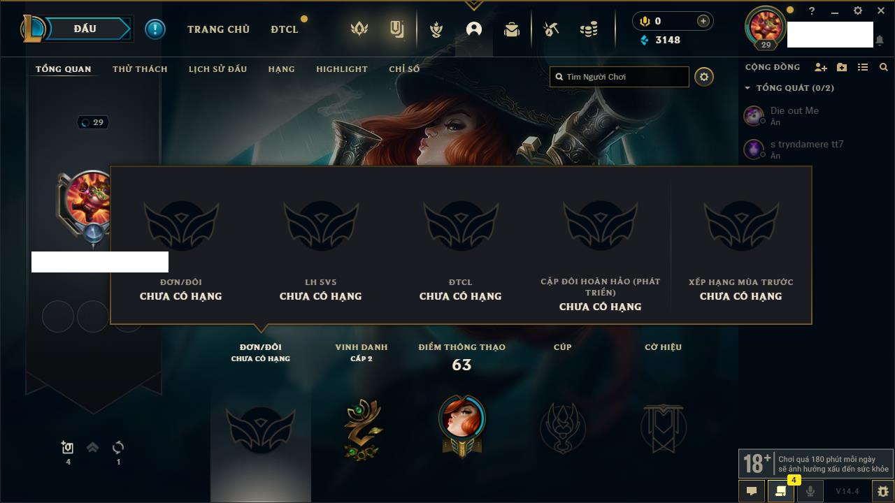 Rank Đơn: Chưa rank mùa nàoKhung: Chưa có khungTướng: 147 - Còn 13200 THXTrang Phục: 0Rank ĐTCL: Chưa RankLinh Thú: 2