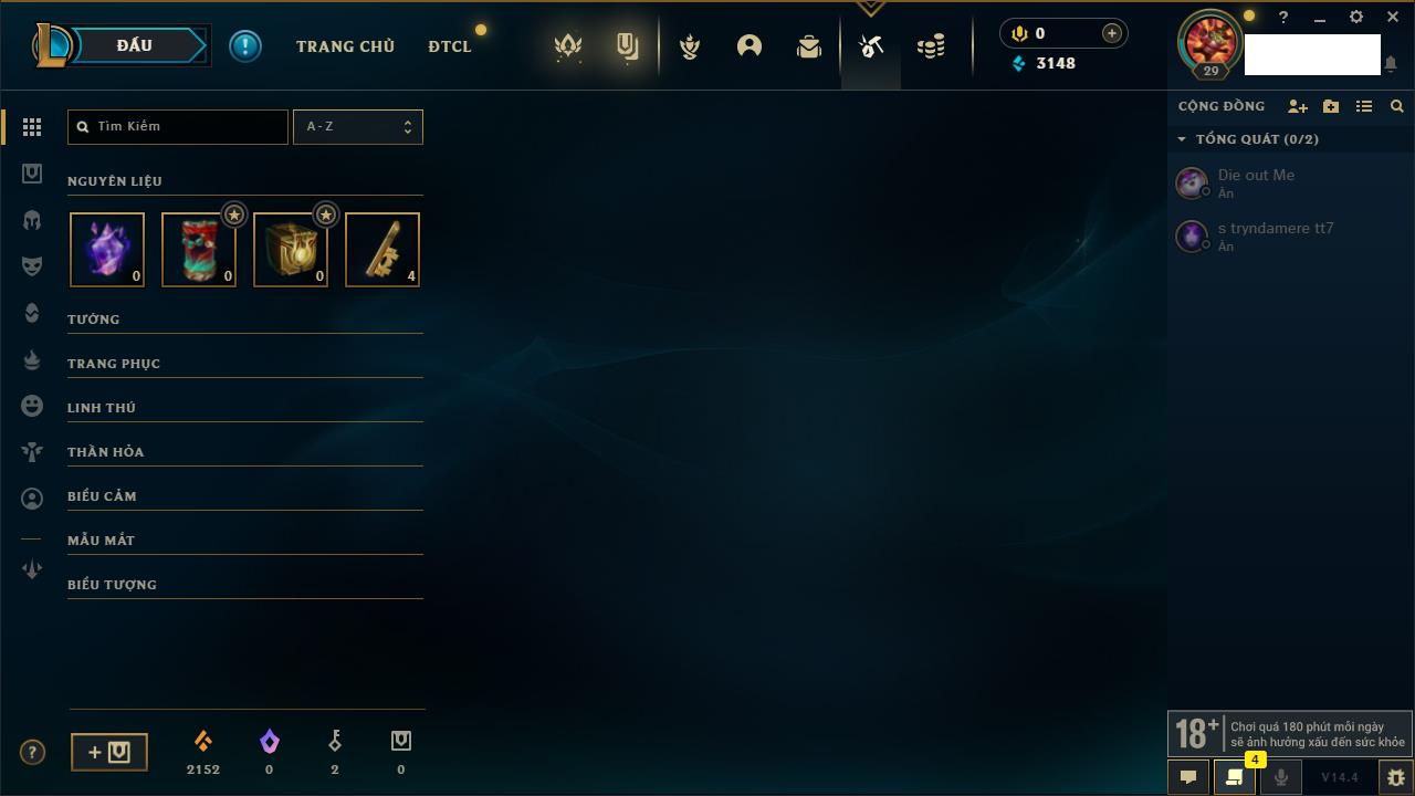 Rank Đơn: Chưa RankKhung: Chưa có khungTướng: 29 - Còn 54 THXTrang Phục: 0Rank ĐTCL: Chưa RankLinh Thú: 1