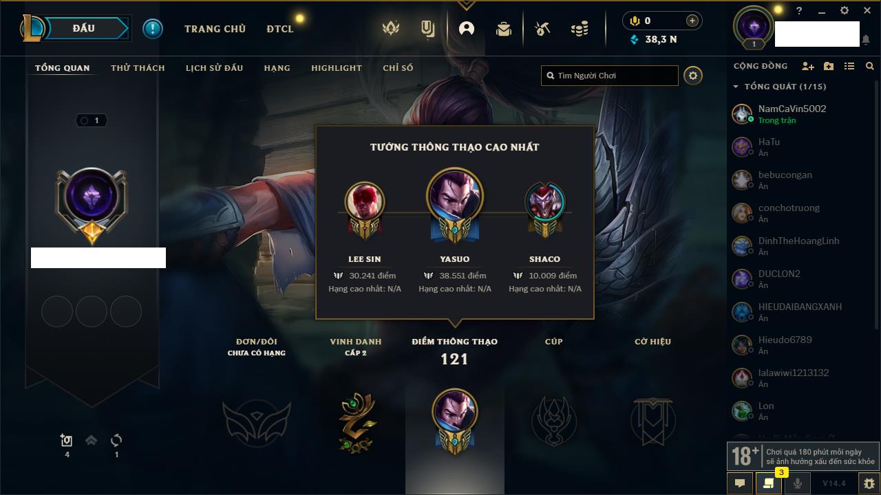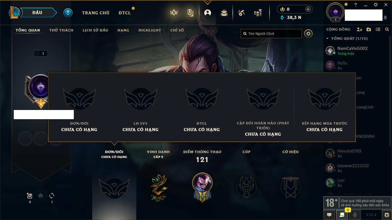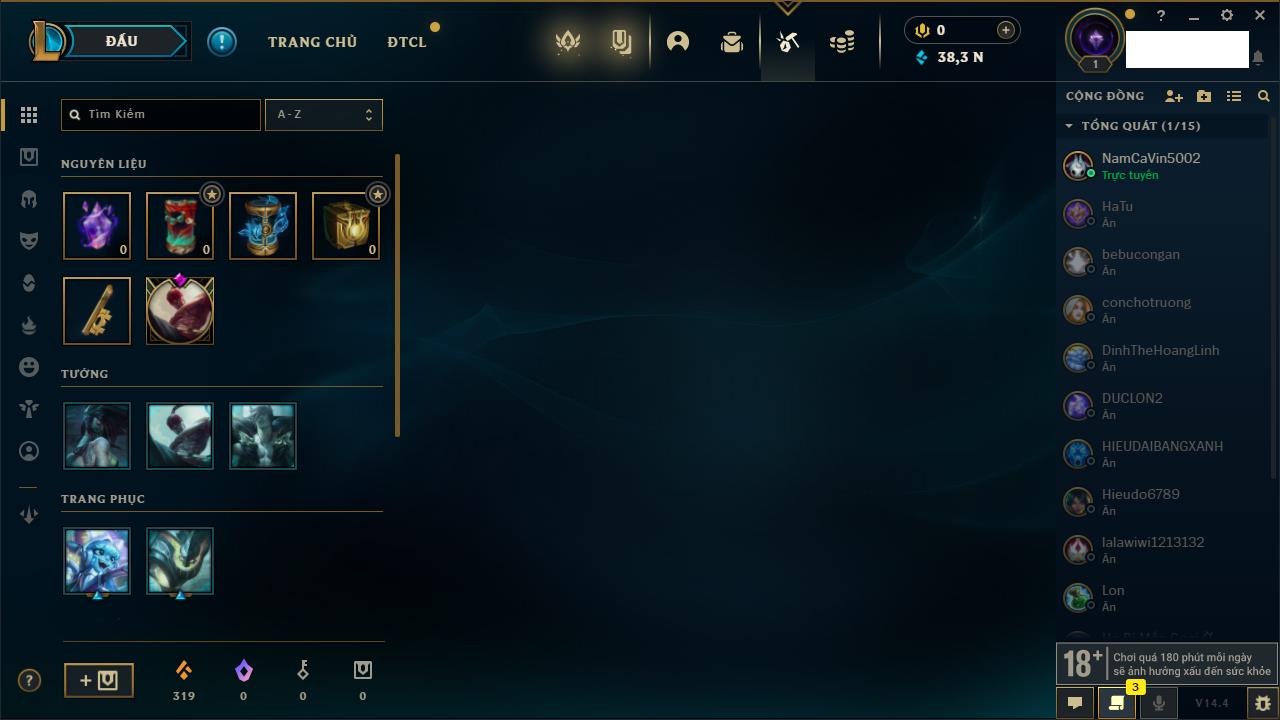 Rank Đơn: Chưa rank mùa nàoKhung: Chưa có khungTướng: 157 - Còn 34195 THXTrang Phục: 7Rank ĐTCL: Chưa RankLinh Thú: 13