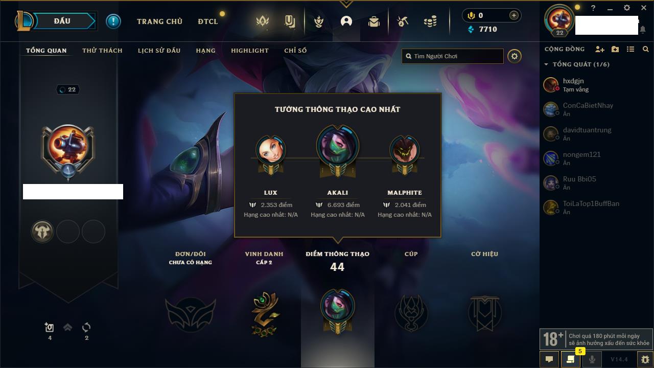 Rank Đơn: Chưa rank mùa nàoKhung: Chưa có khungTướng: 3 - Còn 6810 THXTrang Phục: 0Rank ĐTCL: Chưa RankLinh Thú: 41
