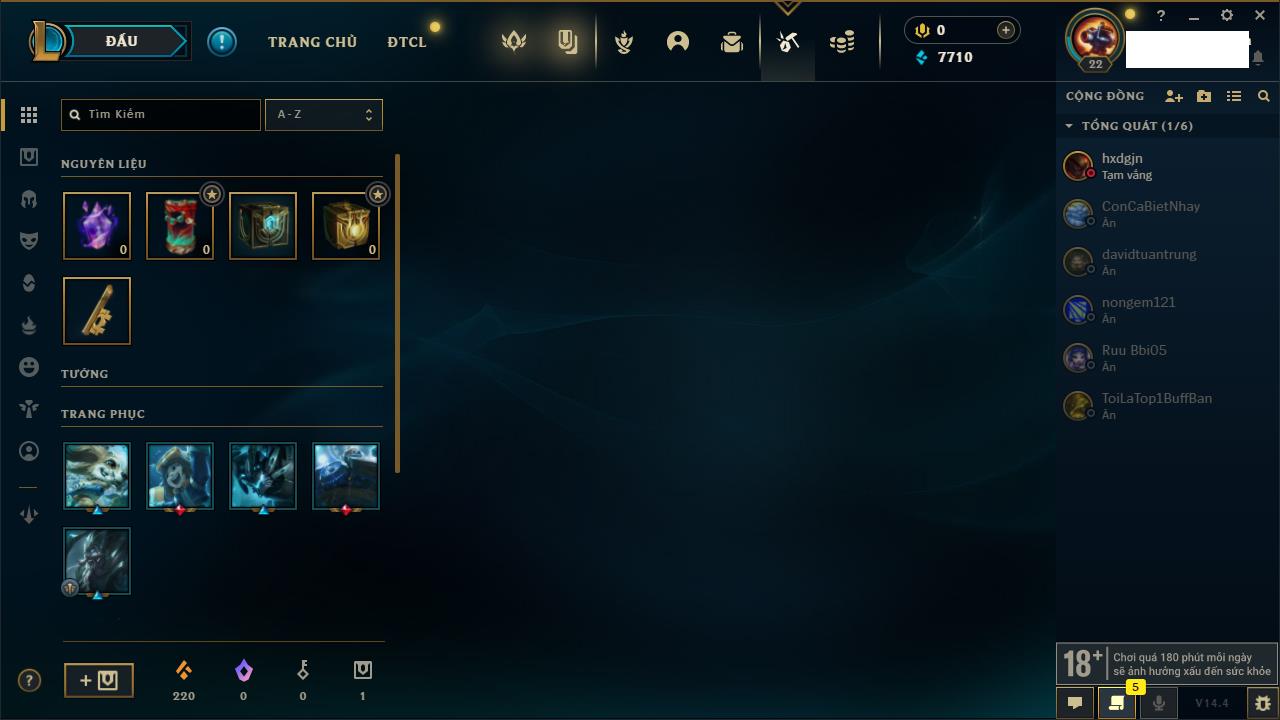 Rank Đơn: Chưa RankKhung: Chưa có khungTướng: 27 - Còn 170 THXTrang Phục: 0Rank ĐTCL: Chưa RankLinh Thú: 33