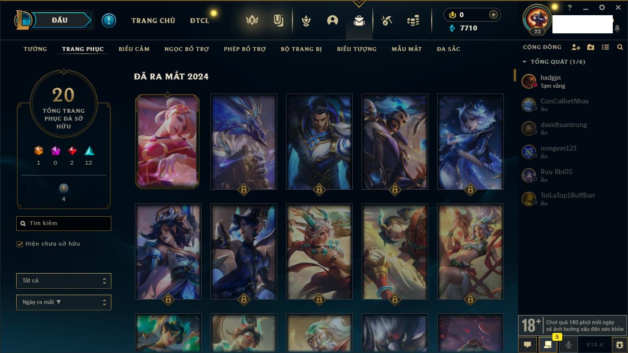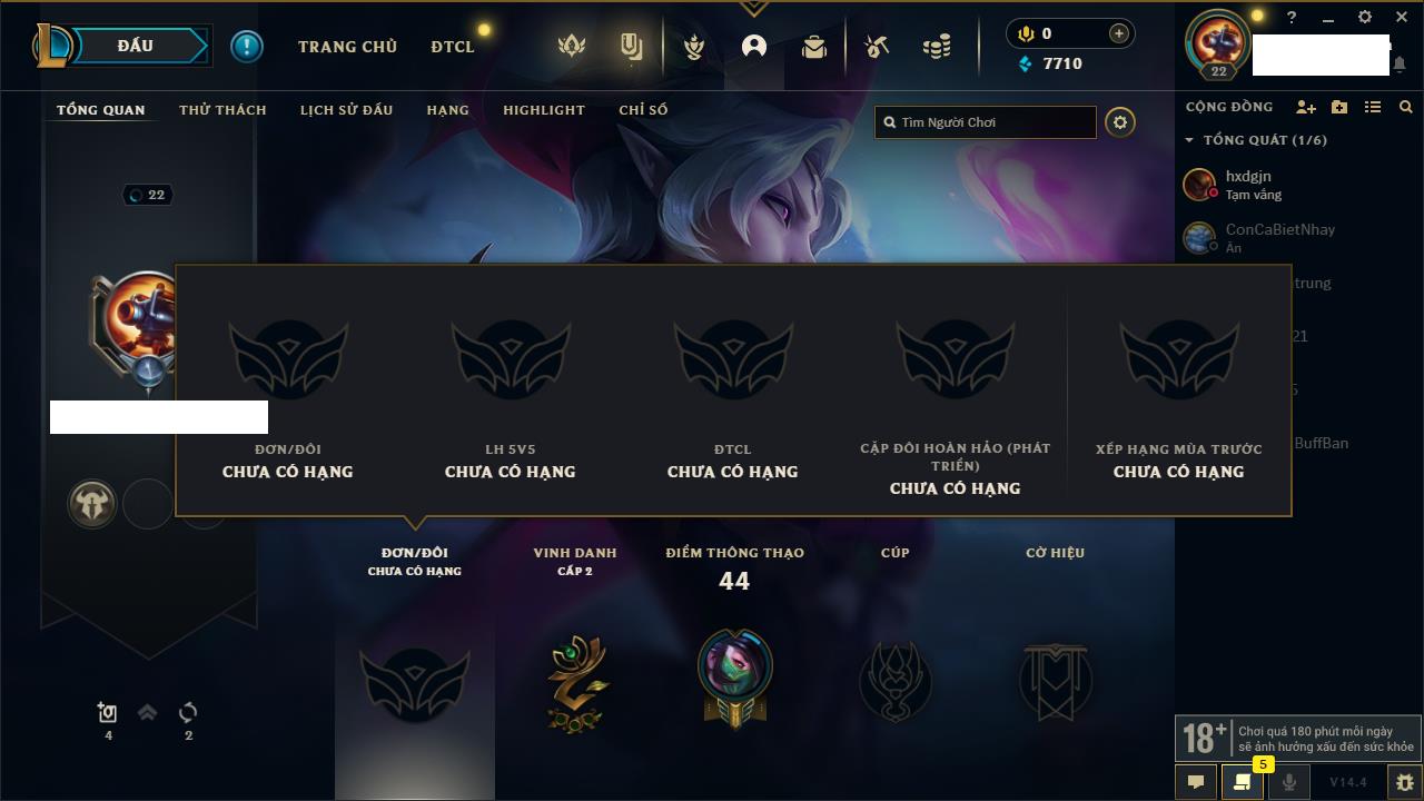 Rank Đơn: Chưa RankKhung: Chưa có khungTướng: 22 - Còn 1295 THXTrang Phục: 1Rank ĐTCL: Chưa RankLinh Thú: 5