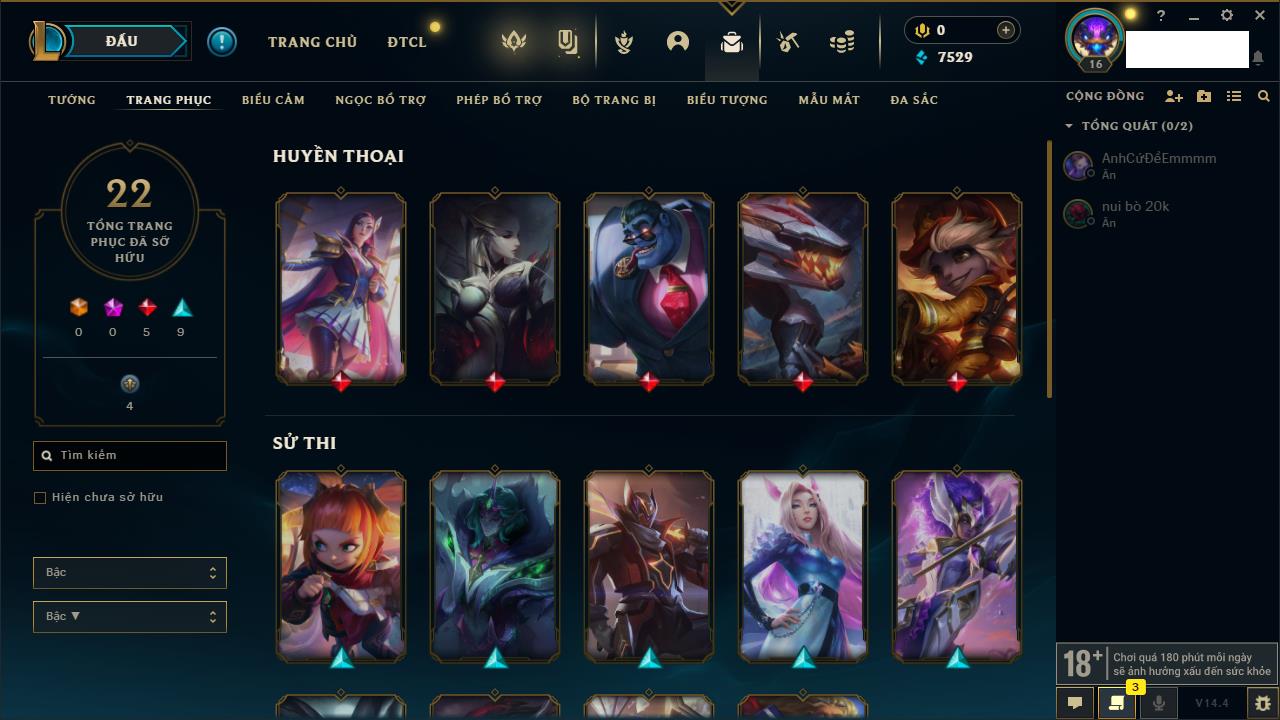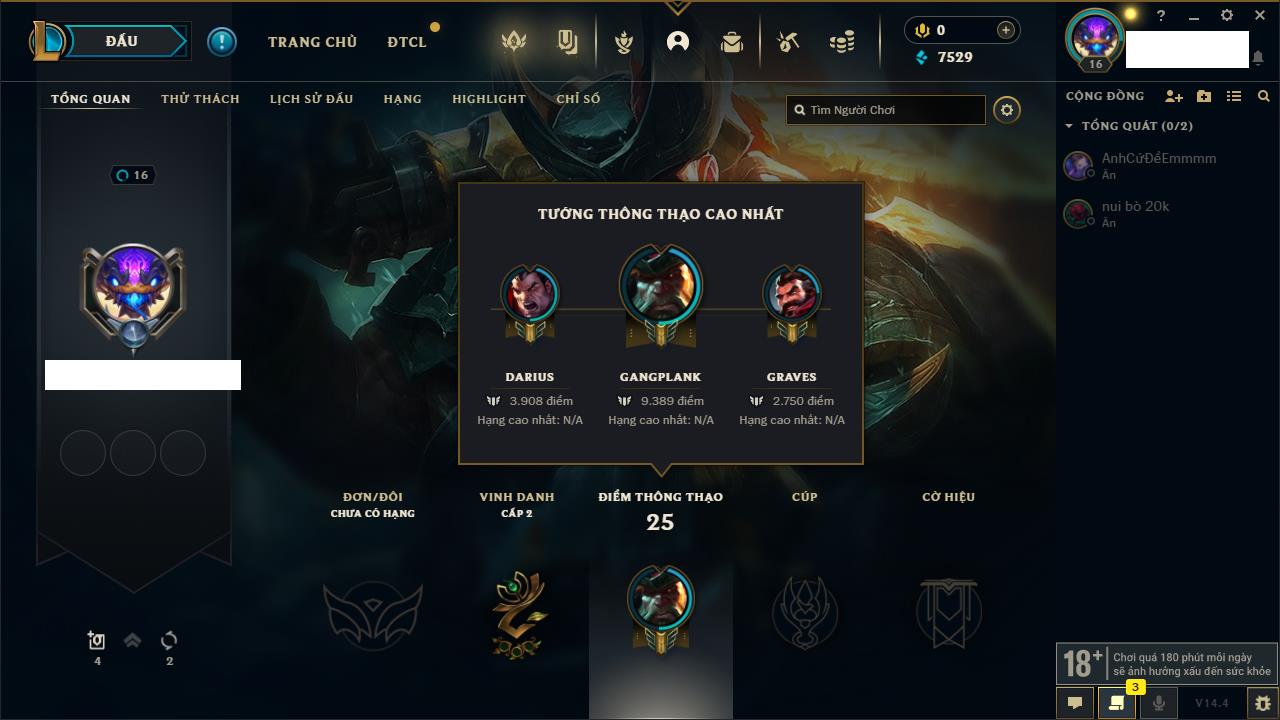 Rank Đơn: Chưa rank mùa nàoKhung: Chưa có khungTướng: 154 - Còn 1660 THXTrang Phục: 6Rank ĐTCL: Chưa RankLinh Thú: 18