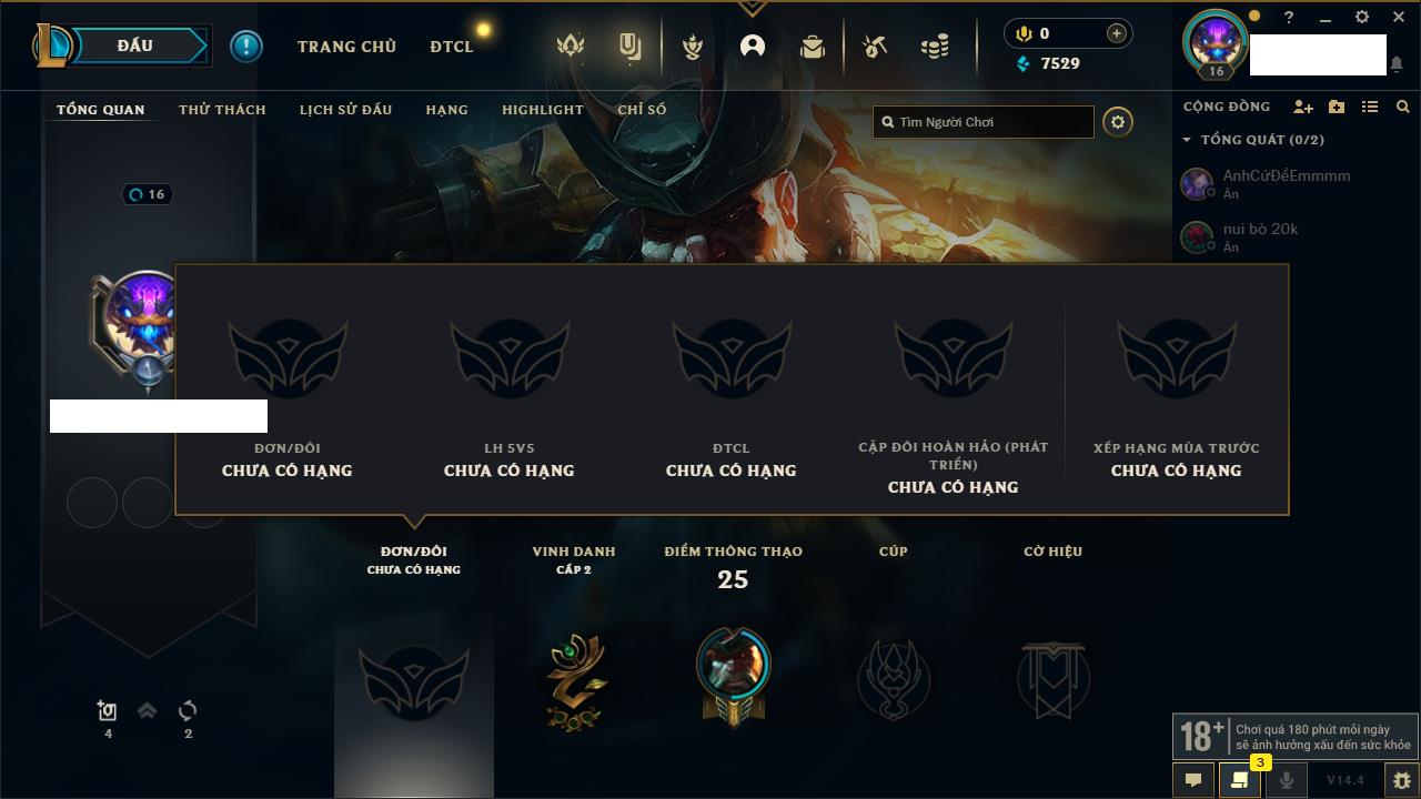 Rank Đơn: Chưa rank mùa nàoKhung: Chưa có khungTướng: 7 - Còn 33750 THXTrang Phục: 0Rank ĐTCL: Bạch Kim ILinh Thú: 25