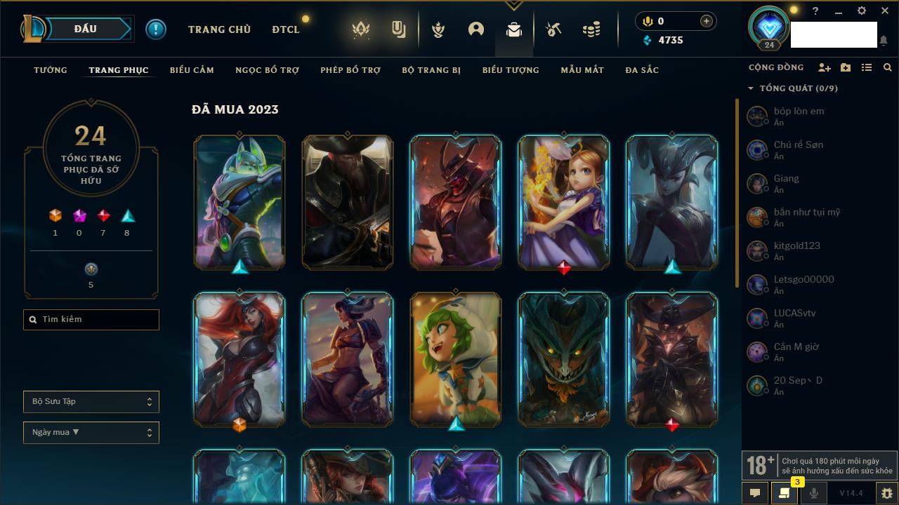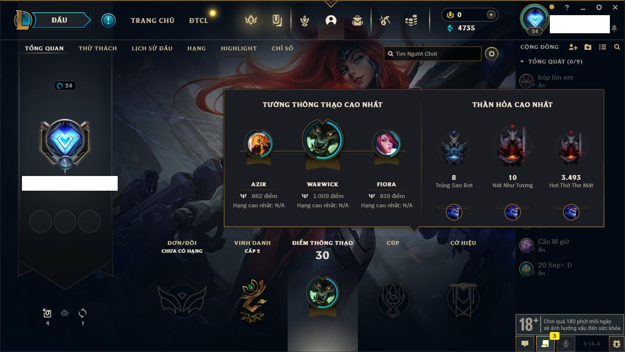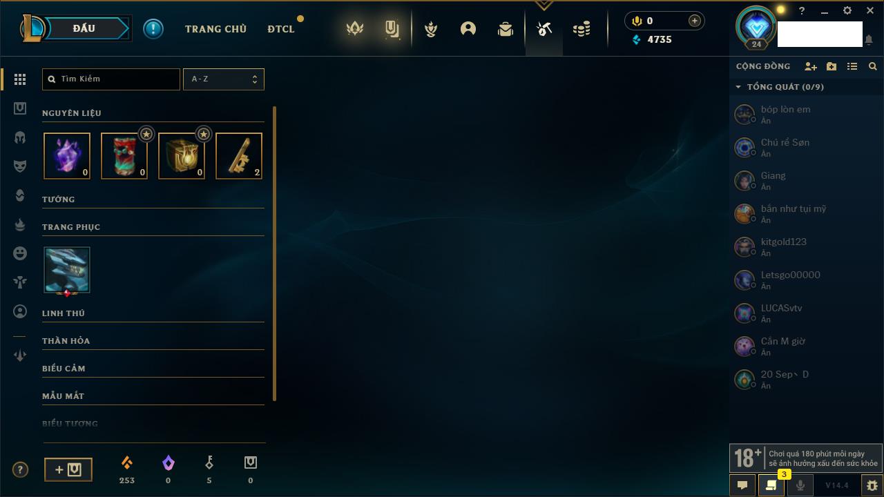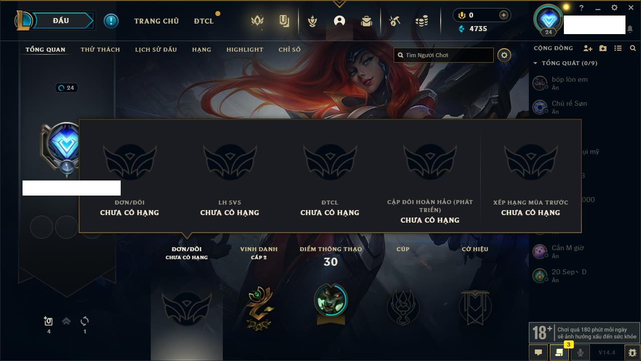 Rank Đơn: Chưa rank mùa nàoKhung: Chưa có khungTướng: 154 - Còn 1660 THXTrang Phục: 6Rank ĐTCL: Chưa RankLinh Thú: 18