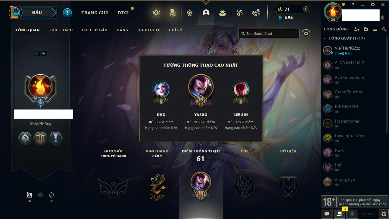 Rank Đơn: Chưa rank mùa nàoKhung: Chưa có khungTướng: 158 - Còn 7570 THXTrang Phục: 5Rank ĐTCL: Chưa RankLinh Thú: 45