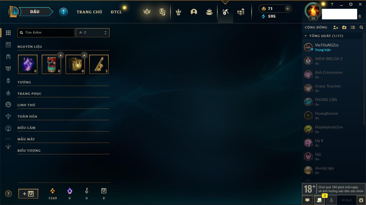Rank Đơn: Chưa rank mùa nàoKhung: Chưa có khungTướng: 0 - Còn 0 THXTrang Phục: 0Rank ĐTCL: Vàng IVLinh Thú: 10