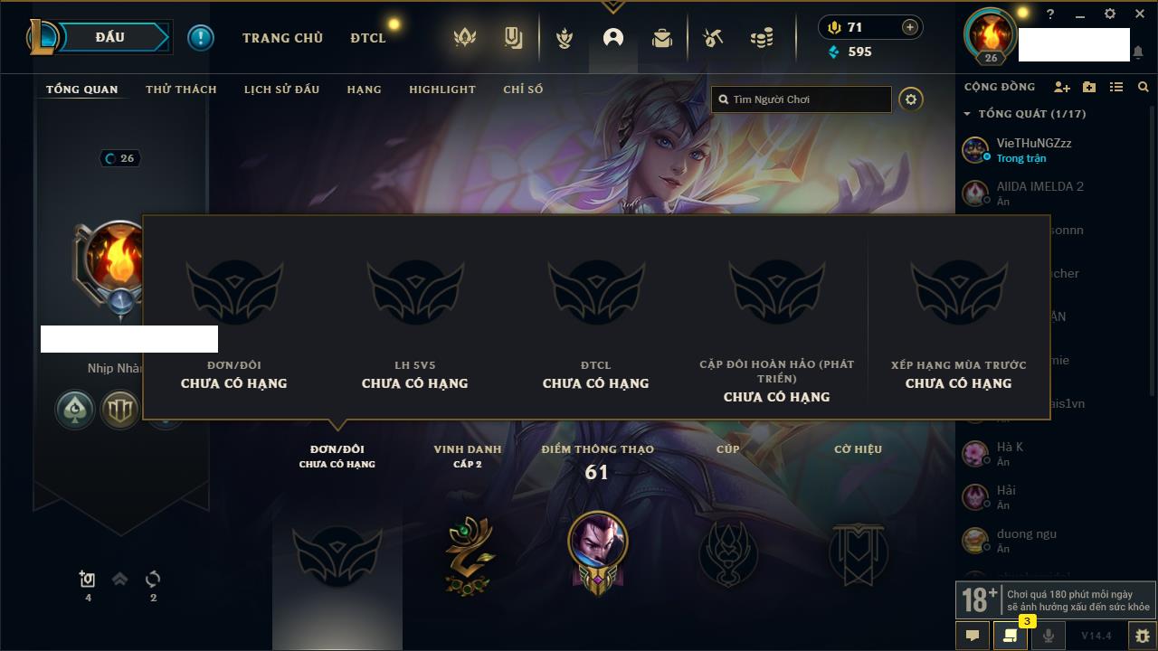 Rank Đơn: Chưa rank mùa nàoKhung: Chưa có khungTướng: 0 - Còn 5500 THXTrang Phục: 0Rank ĐTCL: Vàng IIILinh Thú: 8