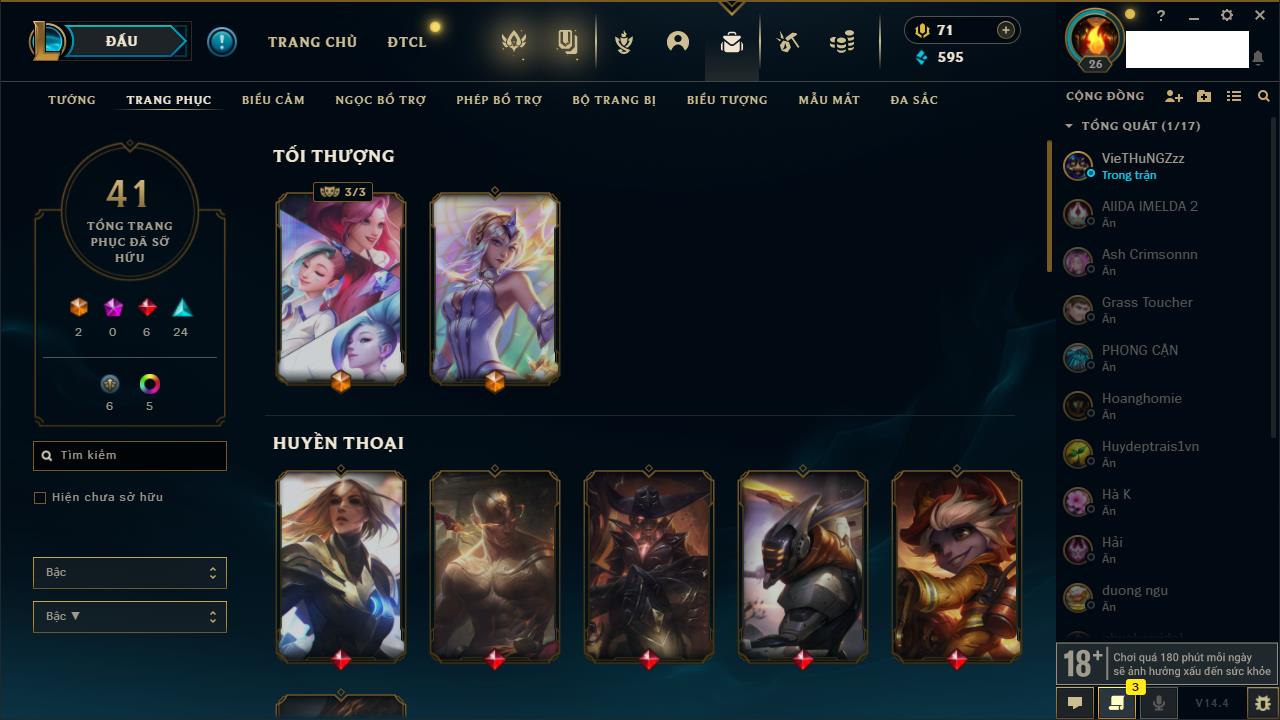 Rank Đơn: Chưa rank mùa nàoKhung: Chưa có khungTướng: 79 - Còn 595 THXTrang Phục: 41Rank ĐTCL: Chưa RankLinh Thú: 4