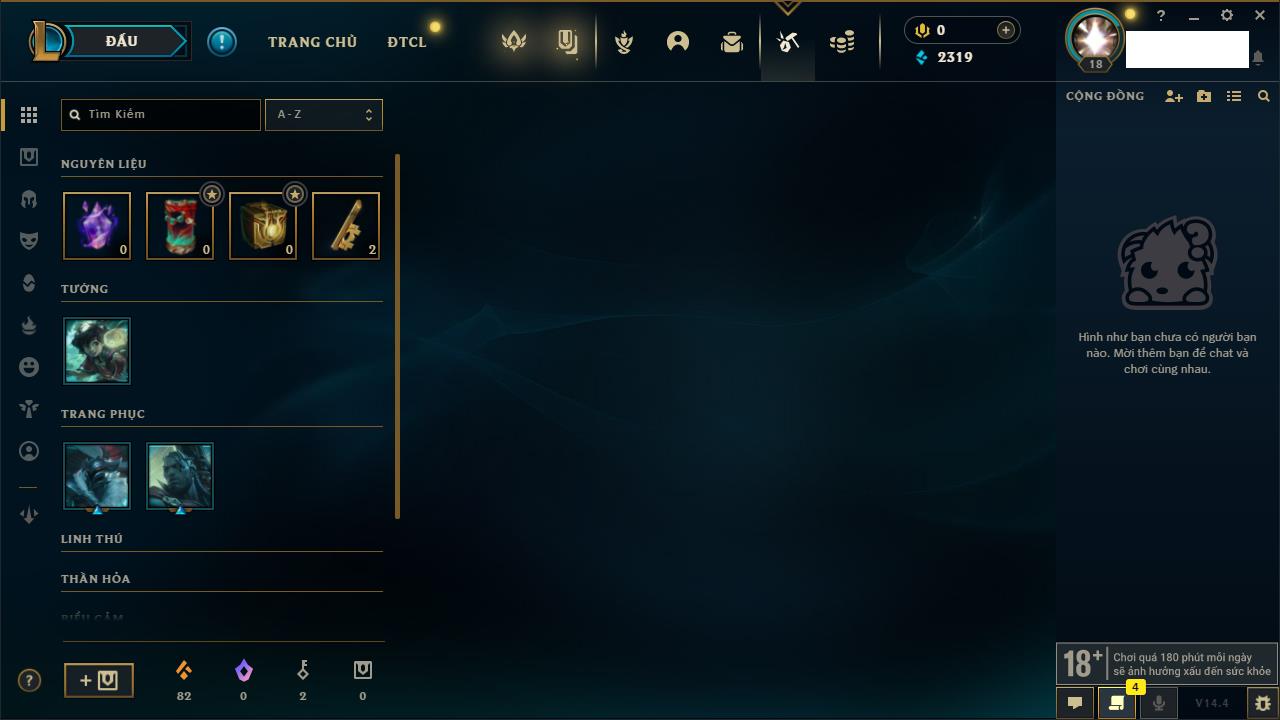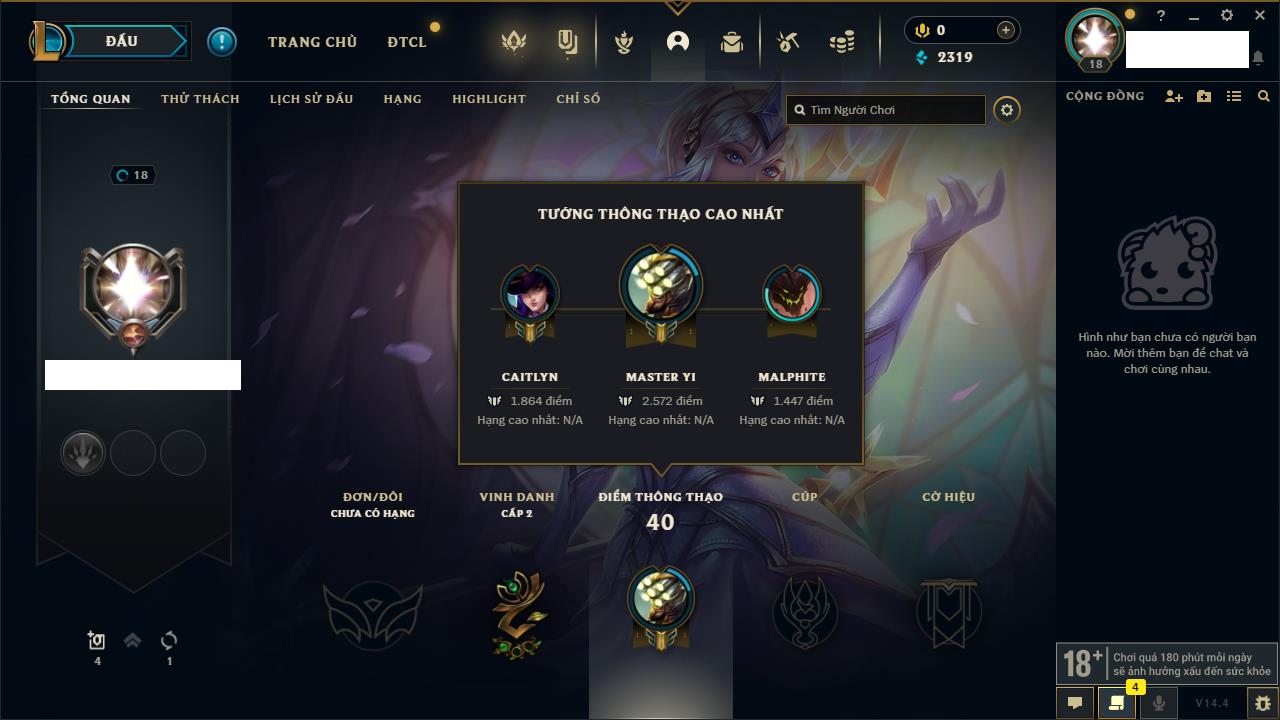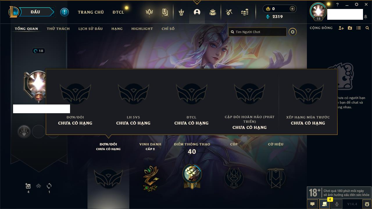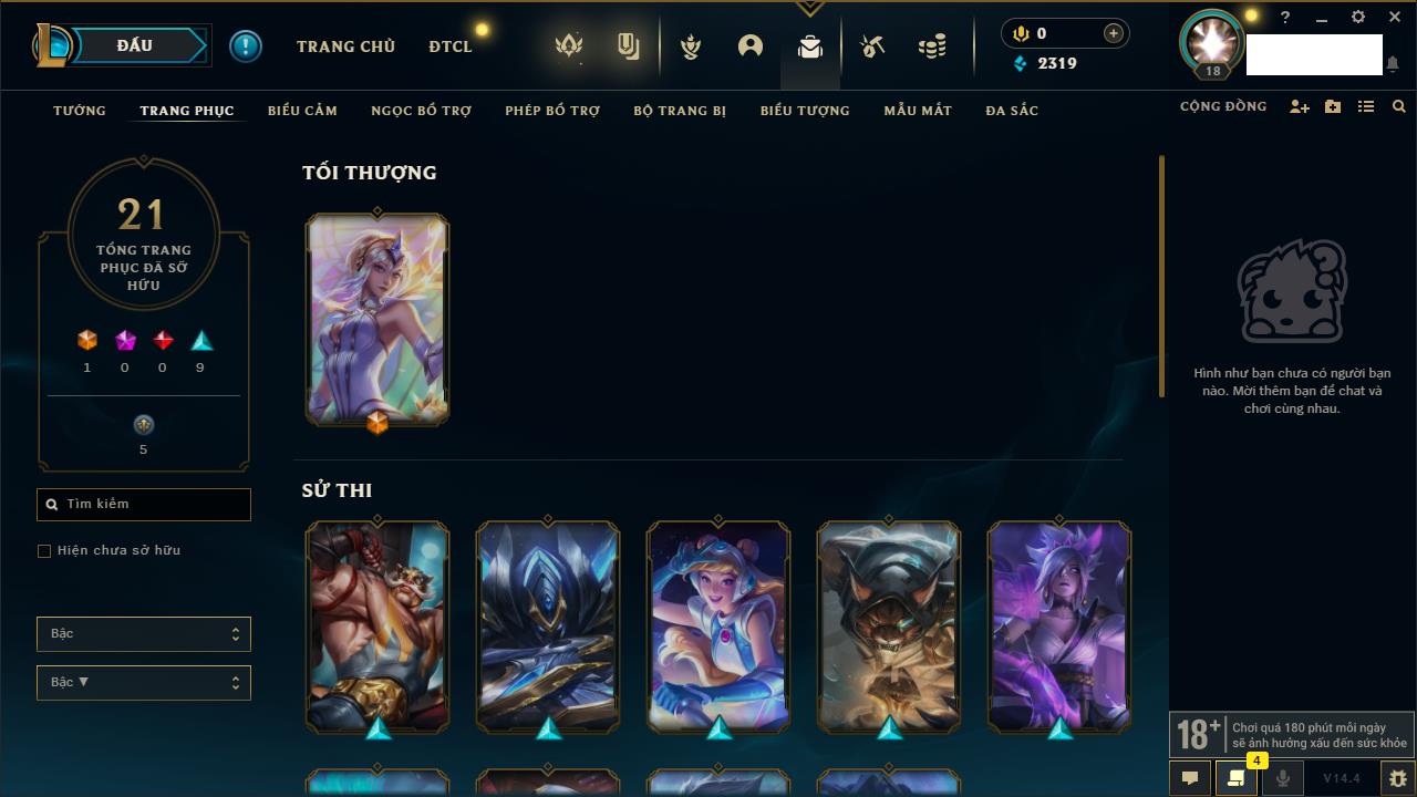 Rank Đơn: Chưa rank mùa nào Khung: Chưa có khung Tướng: 166 - Còn 3090 THX Trang Phục: 9 Rank ĐTCL: Chưa Rank Linh Thú: 125