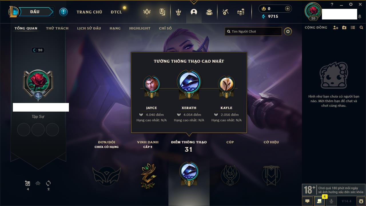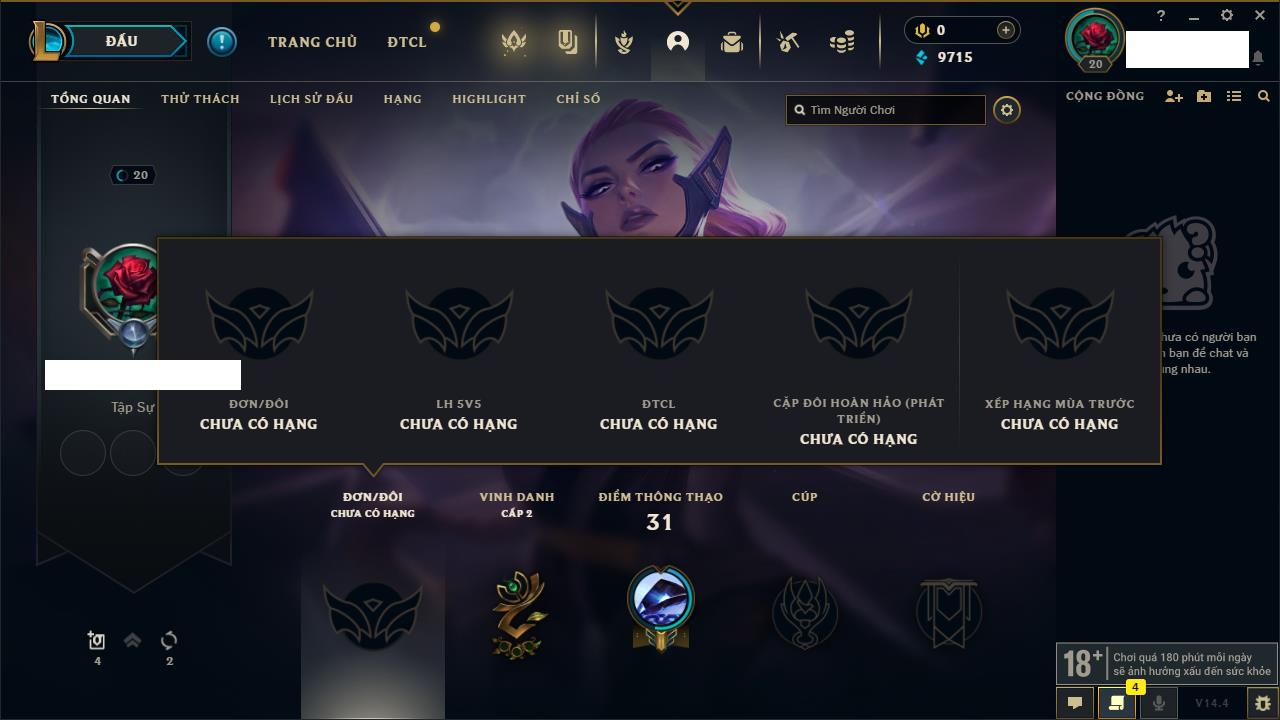Rank Đơn: Sắt IIIKhung: Chưa có khungTướng: 63 - Còn 185 THXTrang Phục: 8Rank ĐTCL: Chưa RankLinh Thú: 75