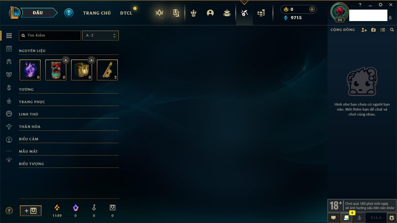 Rank Đơn: Chưa rank mùa nàoKhung: Chưa có khungTướng: 166 - Còn 3090 THXTrang Phục: 9Rank ĐTCL: Chưa RankLinh Thú: 125