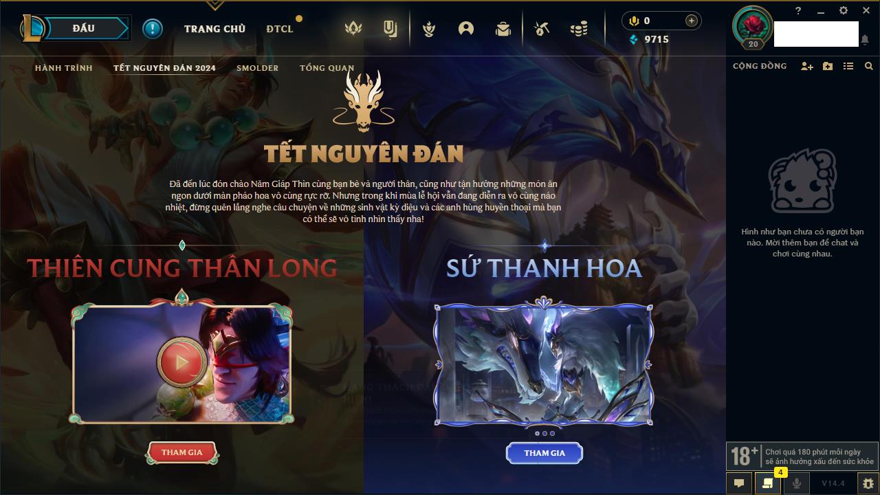 Rank Đơn: Chưa rank mùa nàoKhung: Chưa có khungTướng: 159 - Còn 15030 THXTrang Phục: 5Rank ĐTCL: Chưa RankLinh Thú: 51
