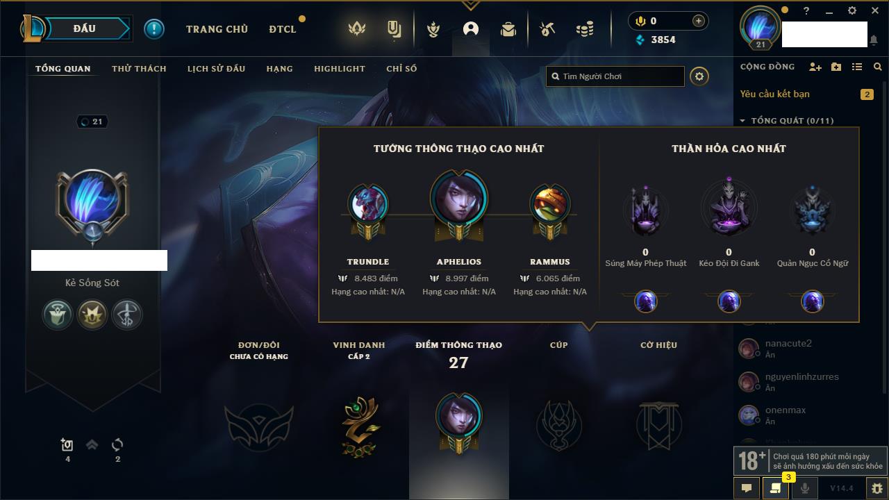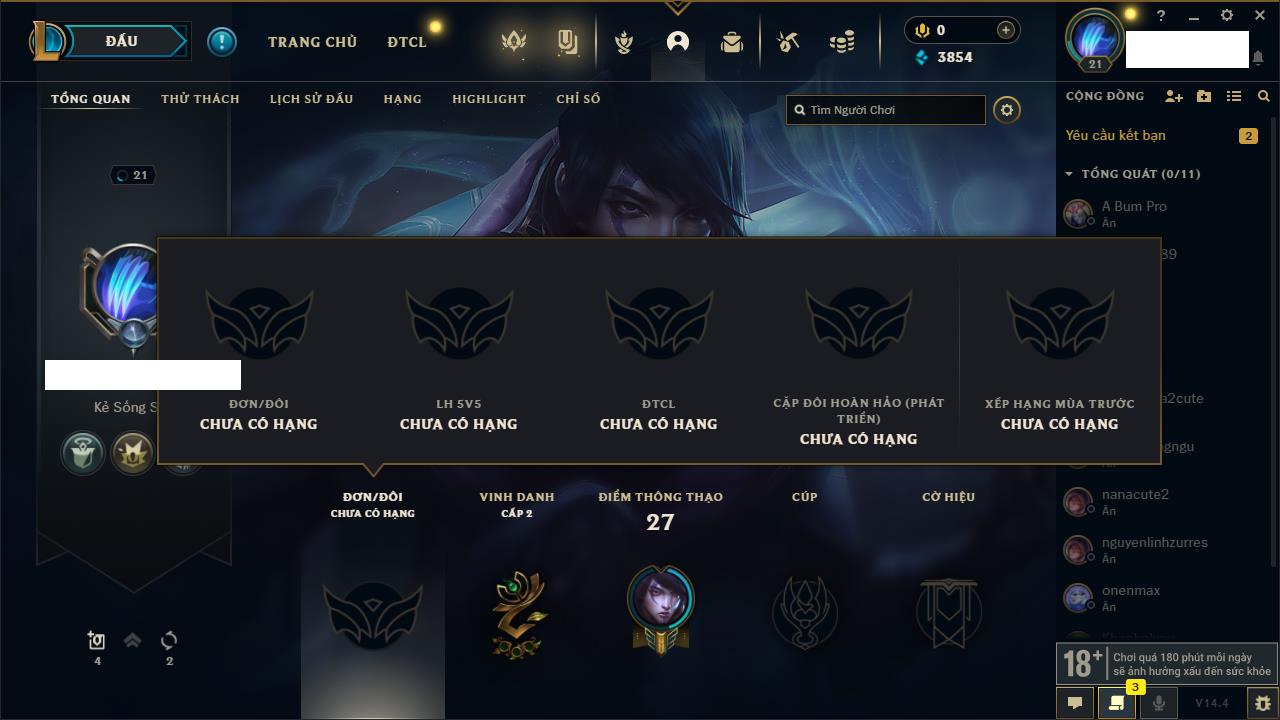 Rank Đơn: Chưa rank mùa nàoKhung: Chưa có khungTướng: 38 - Còn 6280 THXTrang Phục: 2Rank ĐTCL: Chưa RankLinh Thú: 50
