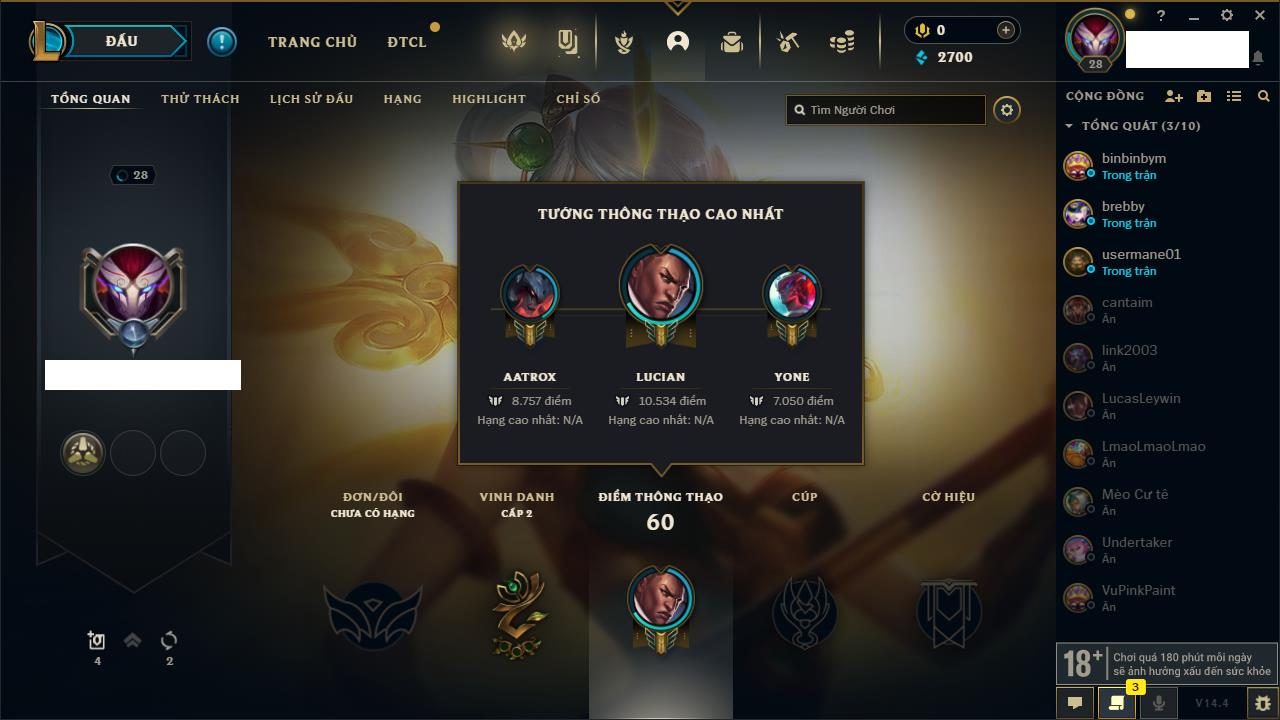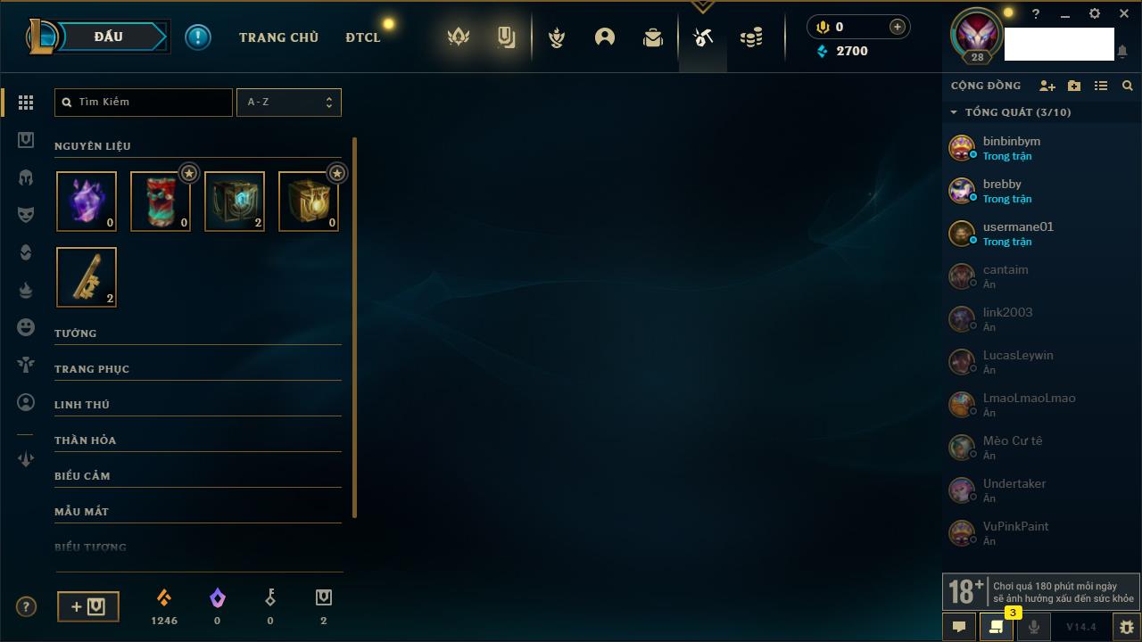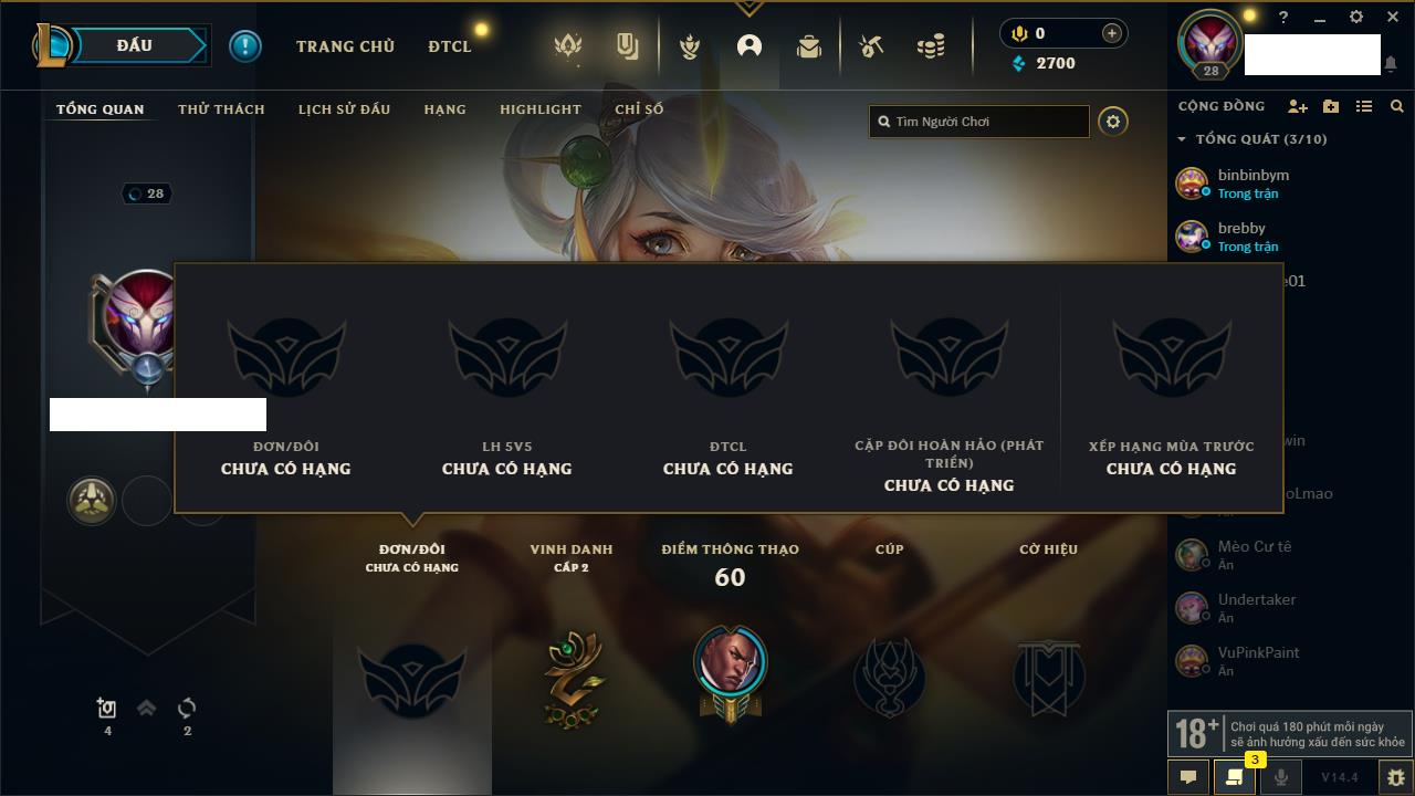 Rank Đơn: Chưa RankKhung: Chưa có khungTướng: 27 - Còn 170 THXTrang Phục: 0Rank ĐTCL: Chưa RankLinh Thú: 33