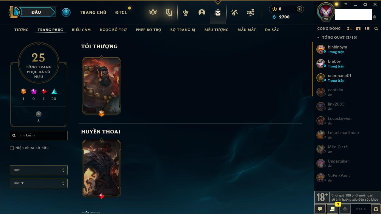Rank Đơn: Chưa rank mùa nàoKhung: Chưa có khungTướng: 28 - Còn 15495 THXTrang Phục: 3Rank ĐTCL: Bạch Kim IIILinh Thú: 10