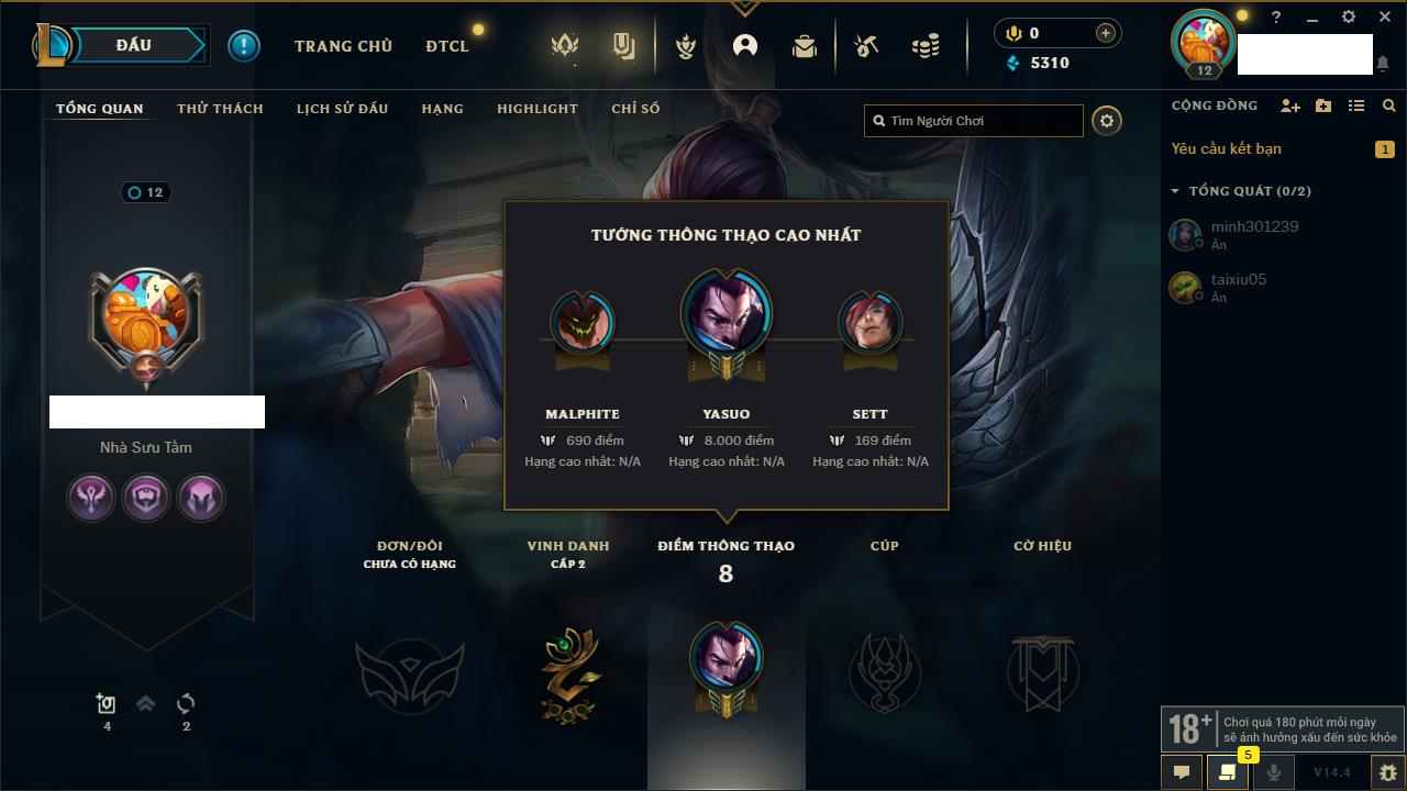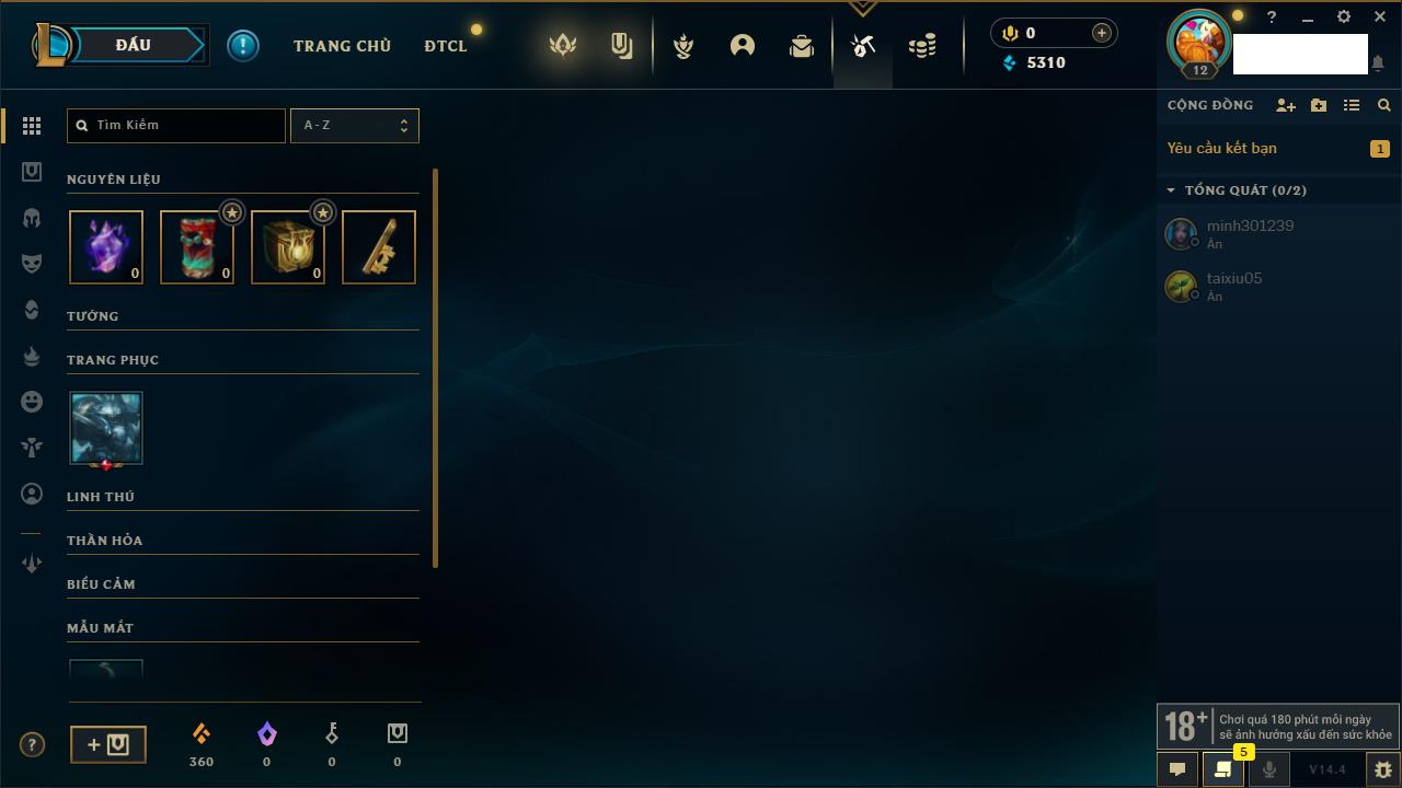 Rank Đơn: Chưa rank mùa nào Khung: Chưa có khung Tướng: 166 - Còn 3090 THX Trang Phục: 9 Rank ĐTCL: Chưa Rank Linh Thú: 125