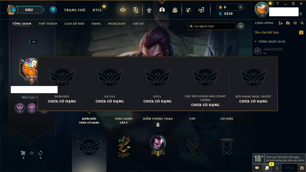 Rank Đơn: Sắt III Khung: Chưa có khung Tướng: 63 - Còn 185 THX Trang Phục: 8 Rank ĐTCL: Chưa Rank Linh Thú: 75