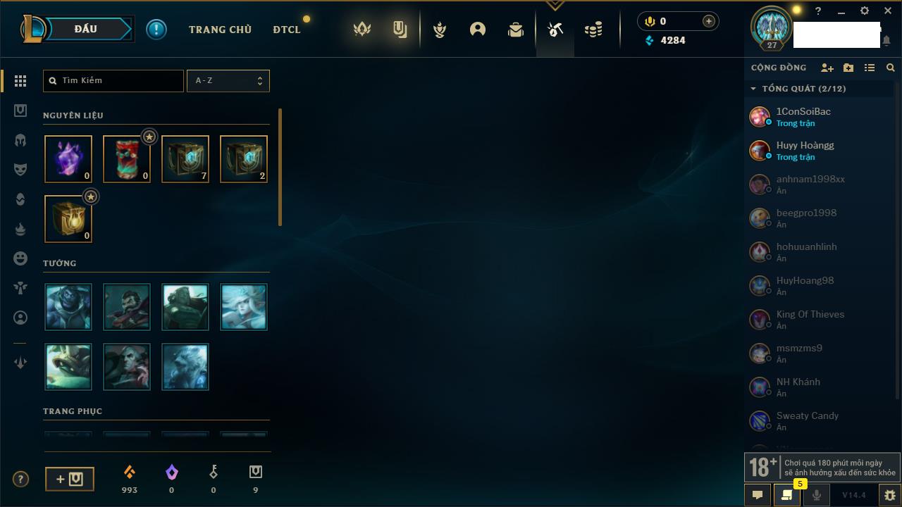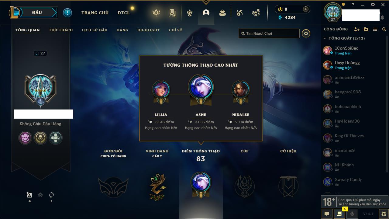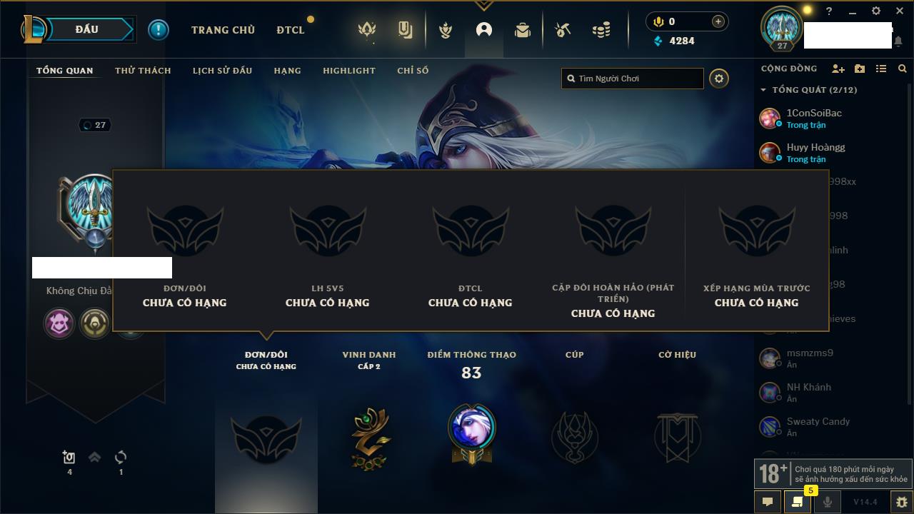 Rank Đơn: Sắt IIIKhung: Chưa có khungTướng: 77 - Còn 8133 THXTrang Phục: 11Rank ĐTCL: Bạch Kim IVLinh Thú: 108