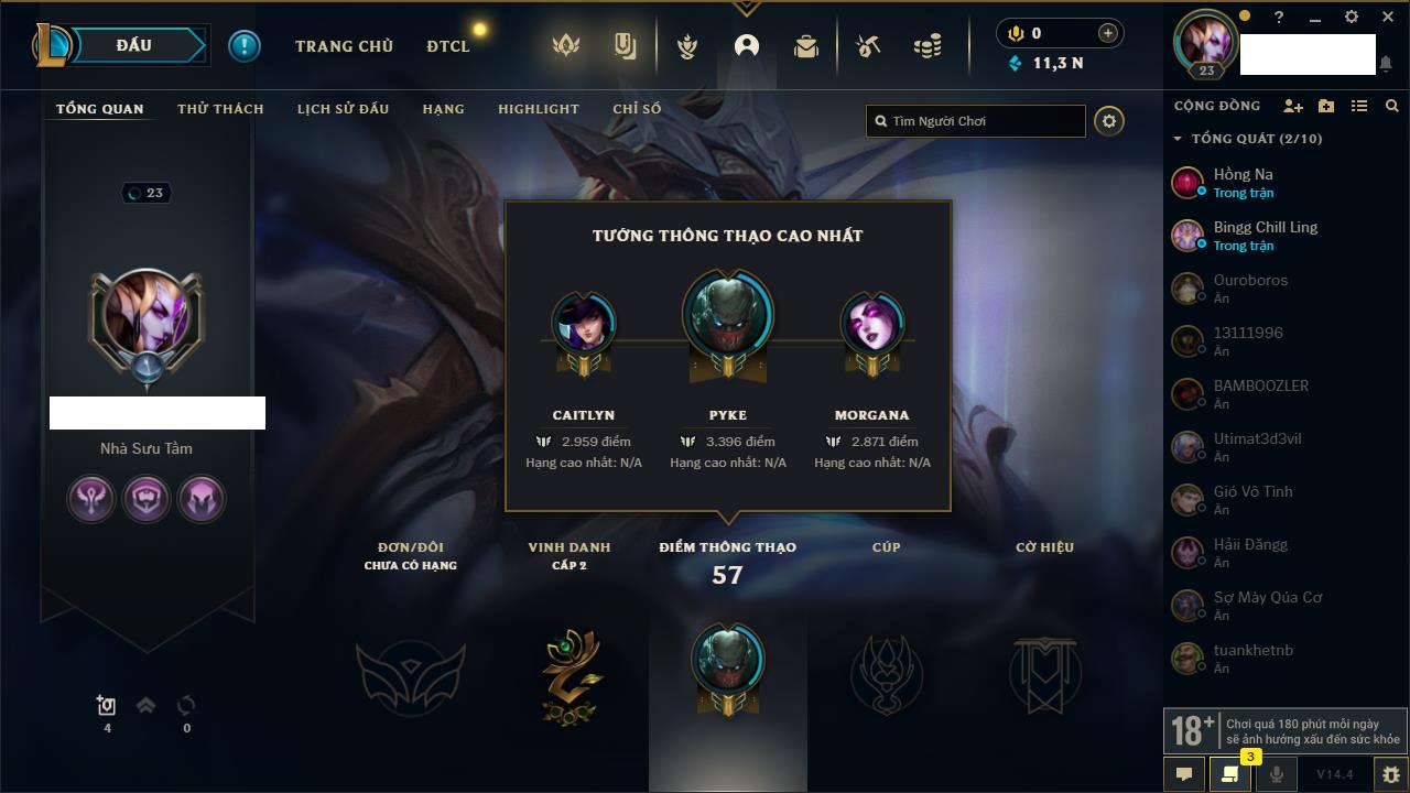 Rank Đơn: Sắt IIIKhung: Chưa có khungTướng: 88 - Còn 1376 THXTrang Phục: 12Rank ĐTCL: Bạc IVLinh Thú: 69