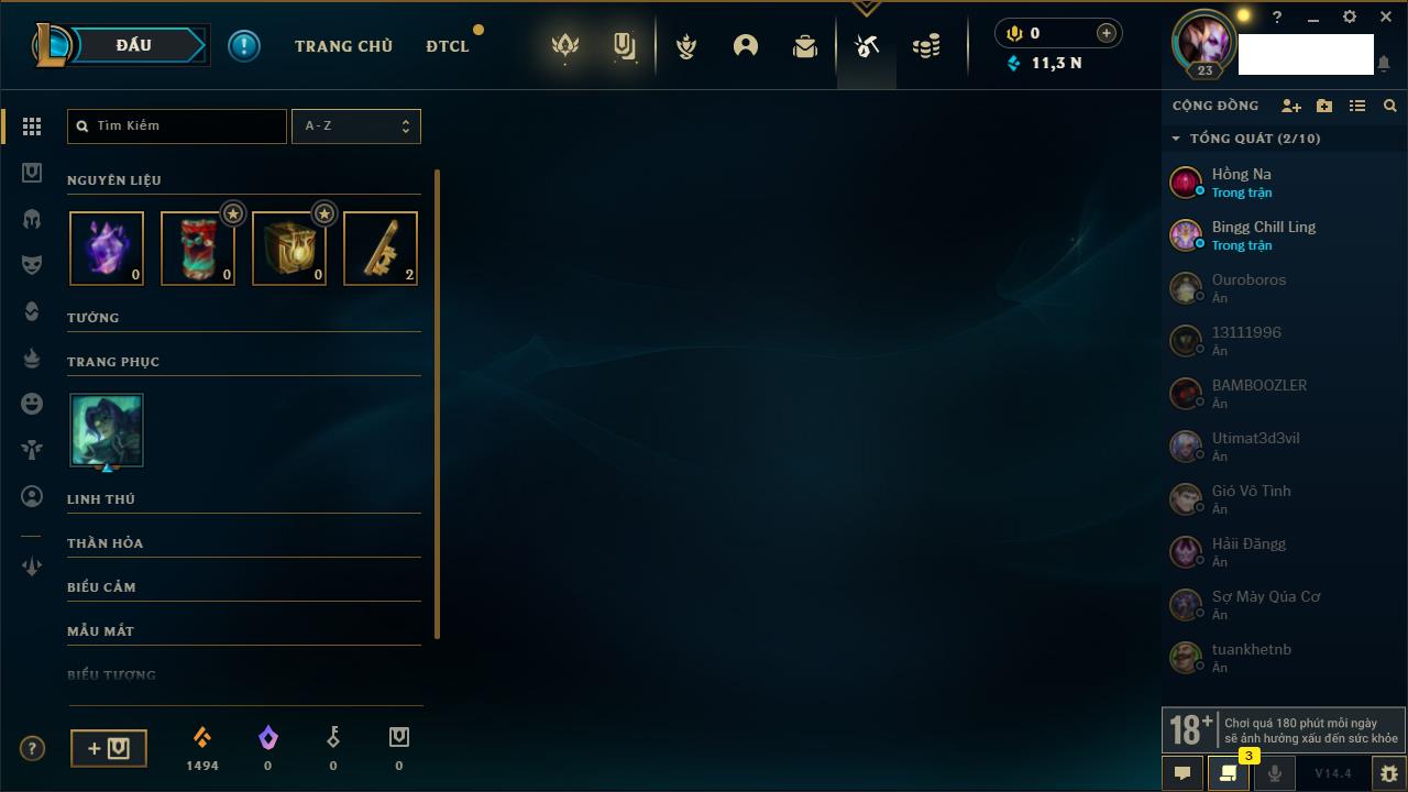 Rank Đơn: Đồng IIIKhung: Chưa có khungTướng: 86 - Còn 14367 THXTrang Phục: 19Rank ĐTCL: Vàng IIILinh Thú: 95
