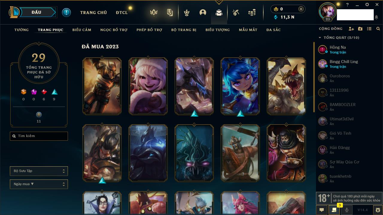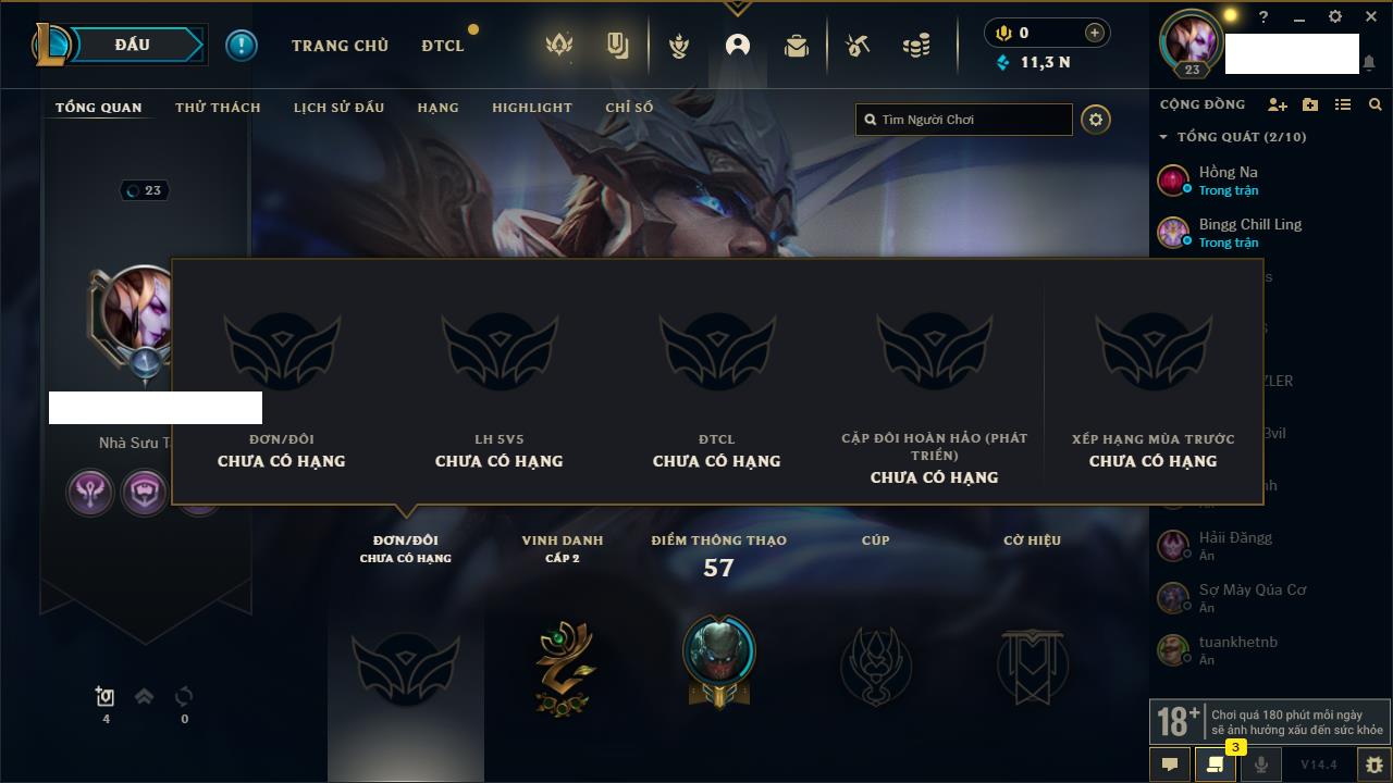 Rank Đơn: Vàng IIIKhung: BạcTướng: 56 - Còn 910 THXTrang Phục: 9Rank ĐTCL: Chưa RankLinh Thú: 31