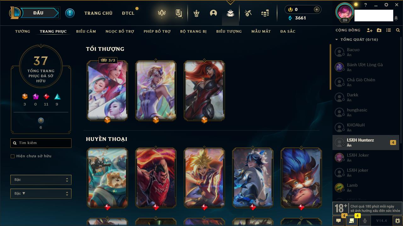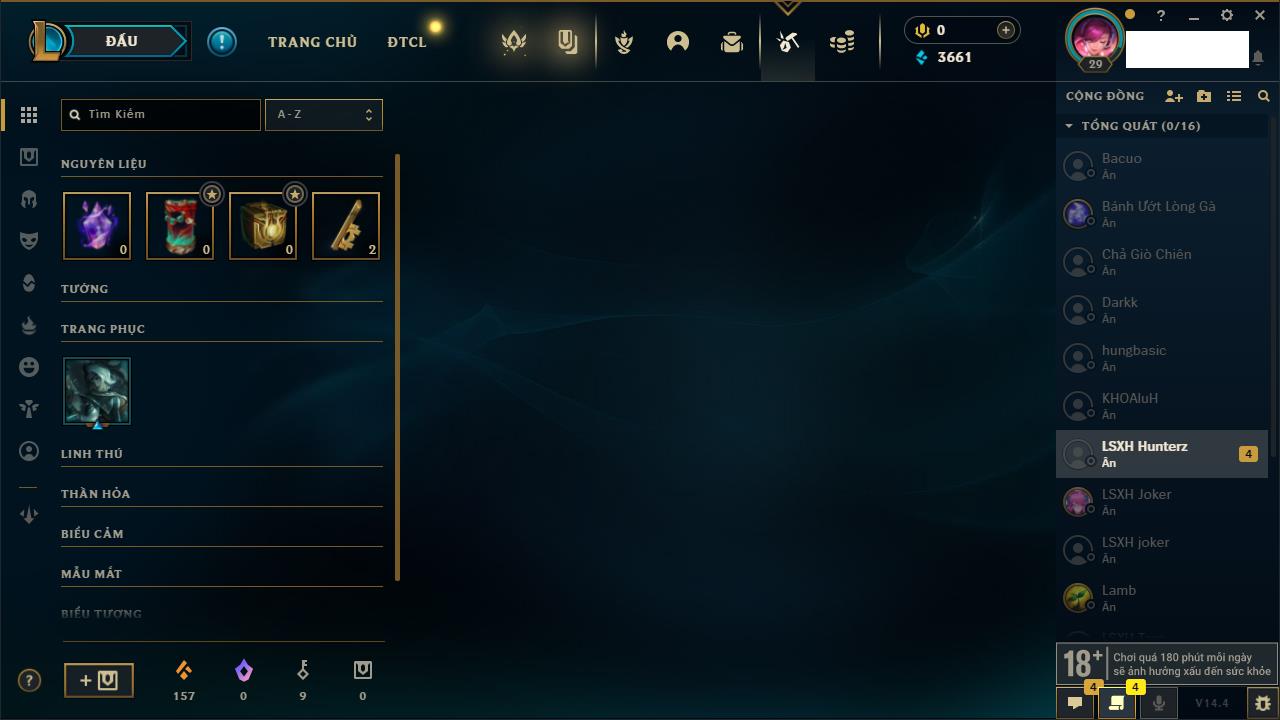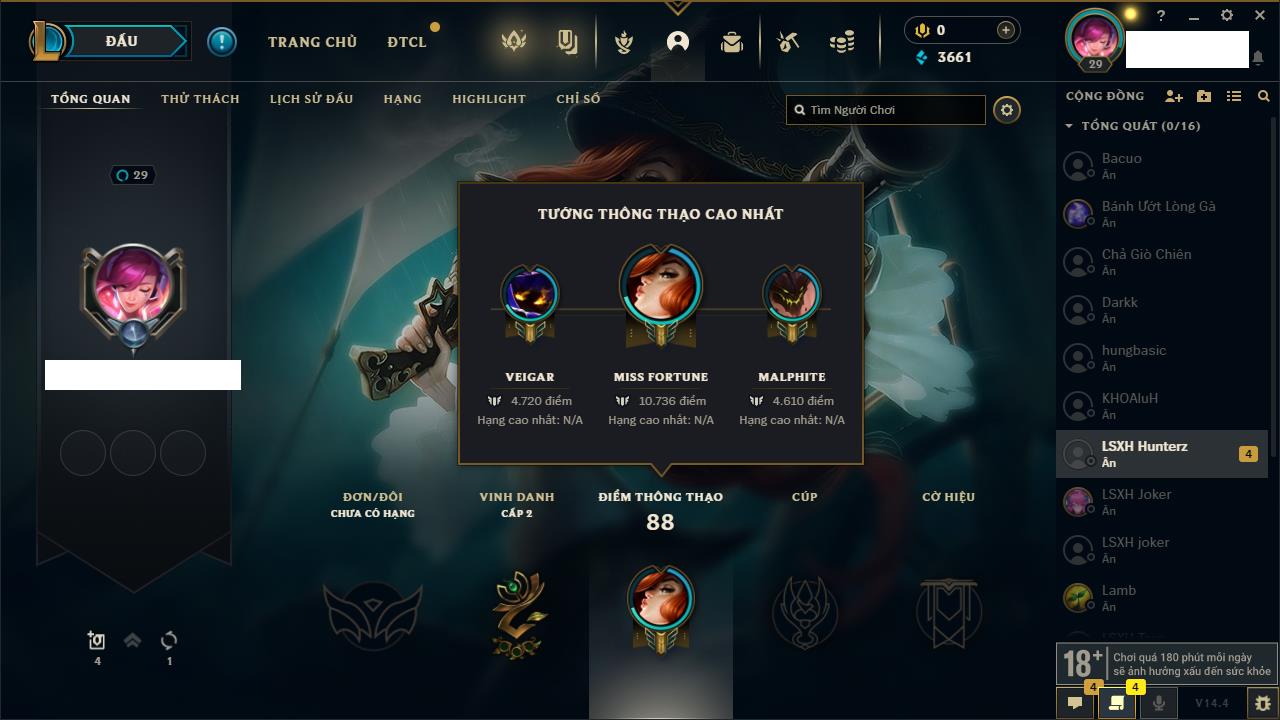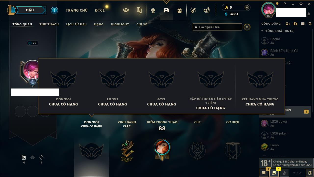 Rank Đơn: Sắt IIIKhung: Chưa có khungTướng: 88 - Còn 1376 THXTrang Phục: 12Rank ĐTCL: Bạc IVLinh Thú: 69