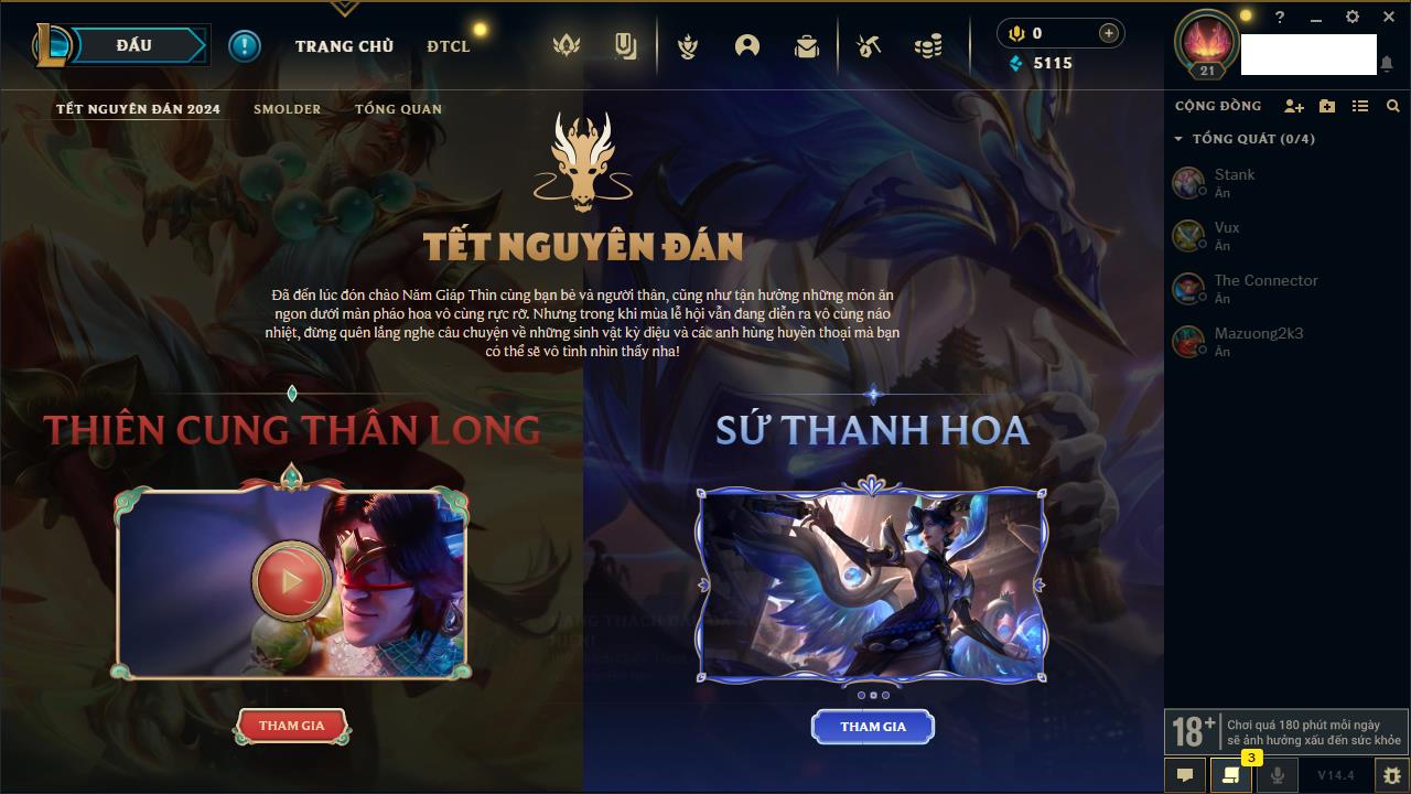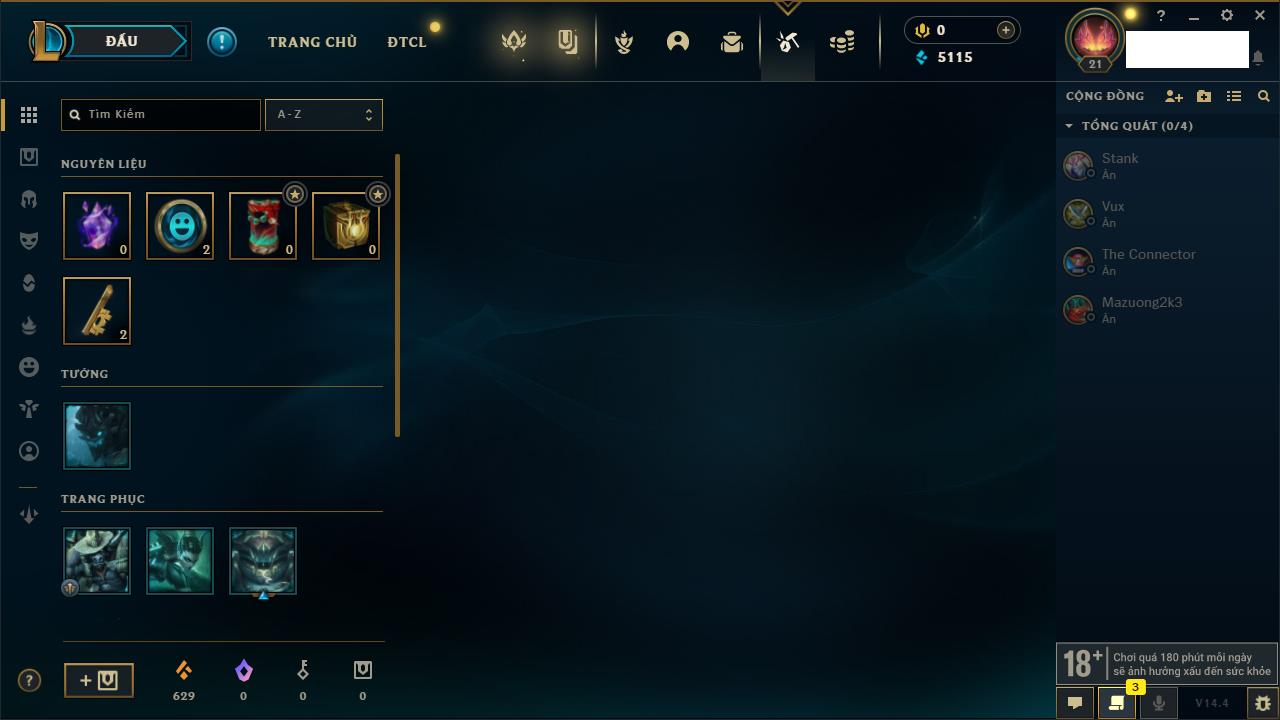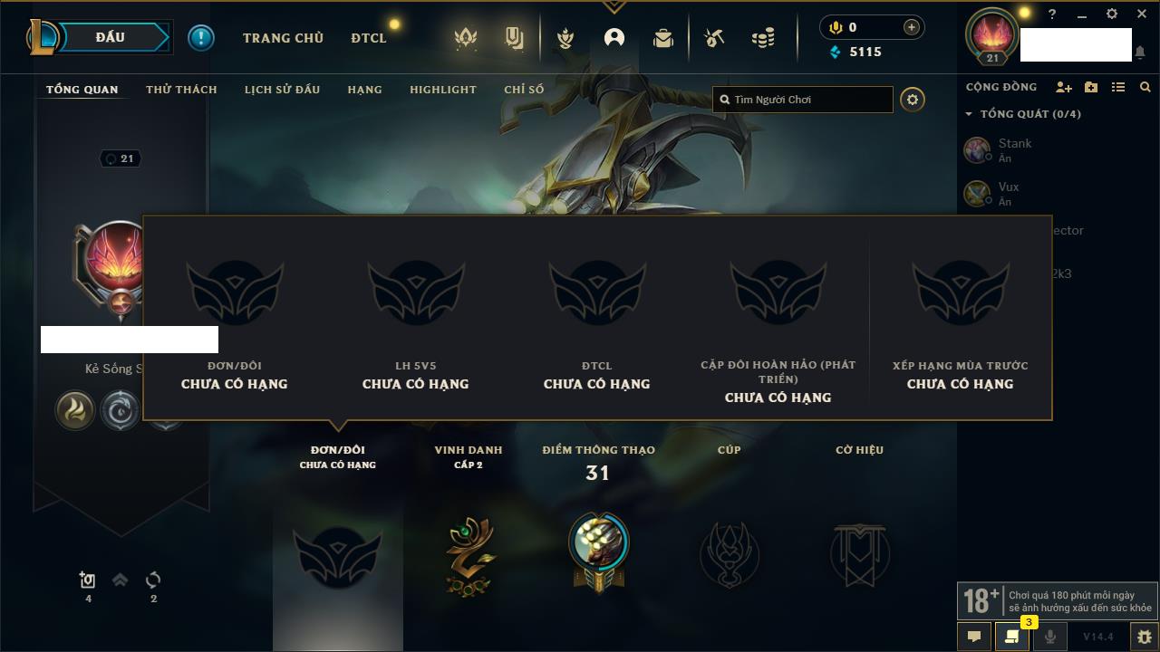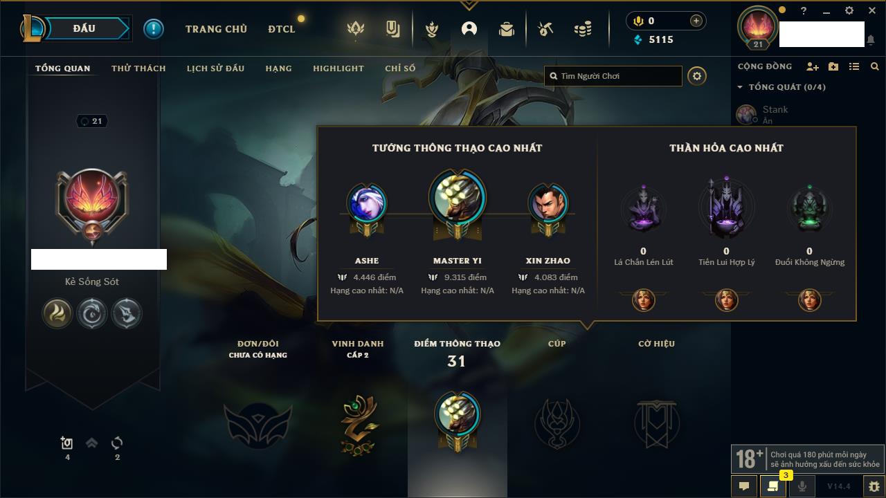 Rank Đơn: Chưa rank mùa nàoKhung: Chưa có khungTướng: 159 - Còn 10220 THXTrang Phục: 14Rank ĐTCL: Chưa rank mùa nàoLinh Thú: 104