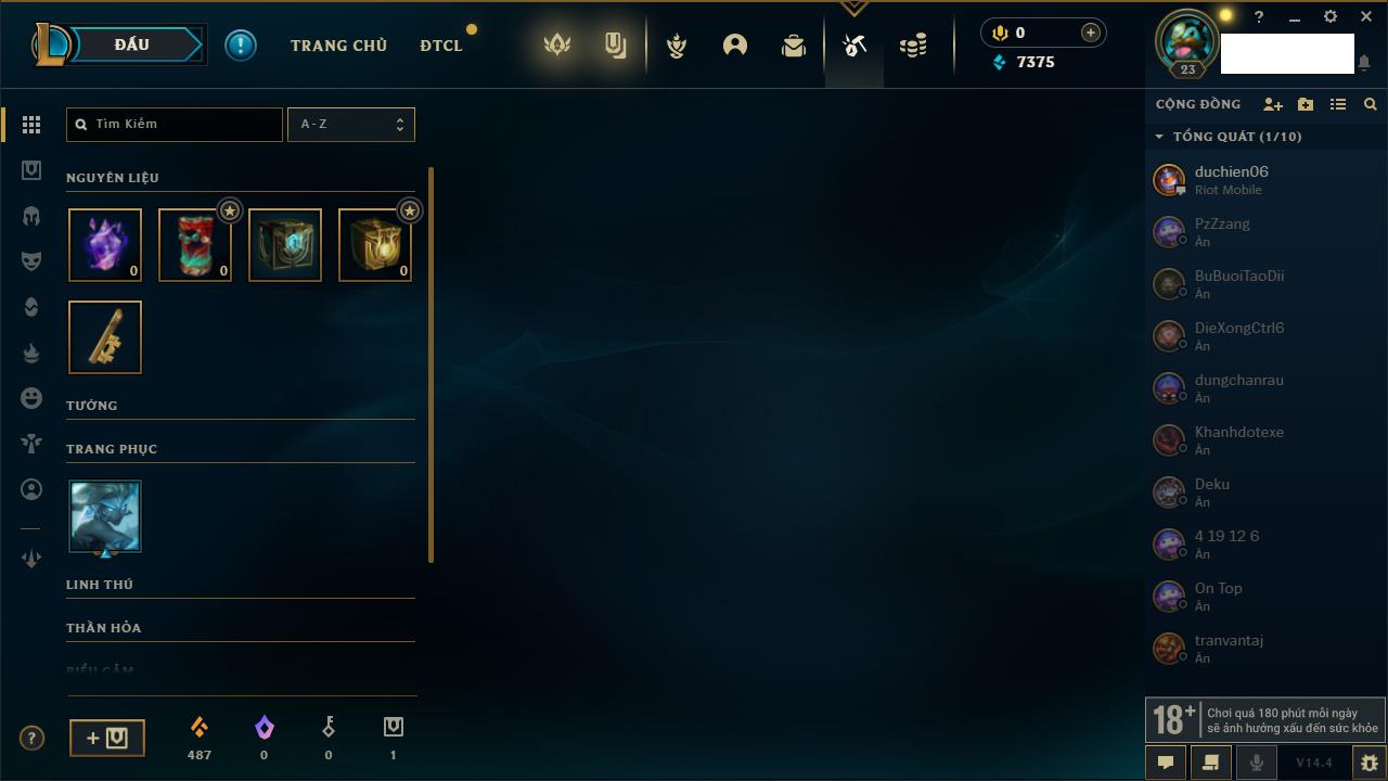 Rank Đơn: Chưa RankKhung: Chưa có khungTướng: 1 - Còn 6000 THXTrang Phục: 0Rank ĐTCL: Chưa RankLinh Thú: 9