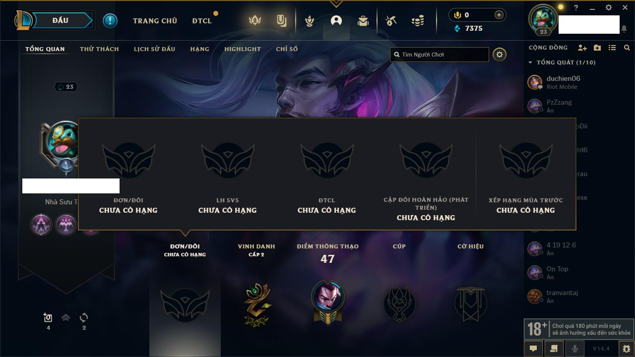 Rank Đơn: Chưa RankKhung: Chưa có khungTướng: 5 - Còn 10650 THXTrang Phục: 1Rank ĐTCL: Chưa RankLinh Thú: 17