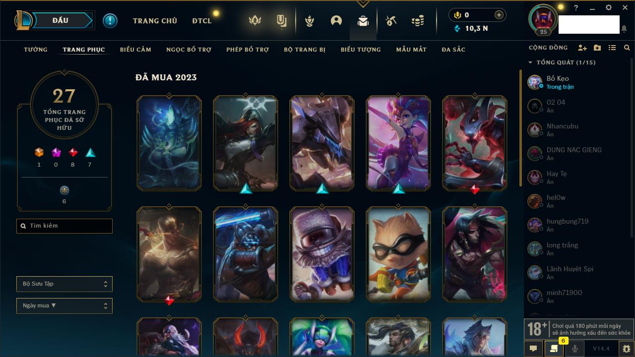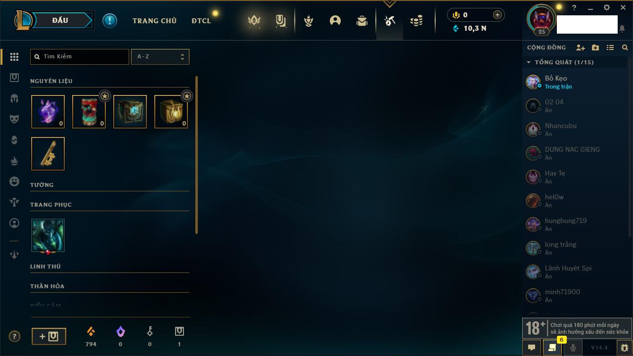 Rank Đơn: Chưa rank mùa nàoKhung: Chưa có khungTướng: 108 - Còn 6515 THXTrang Phục: 23Rank ĐTCL: Chưa RankLinh Thú: 111