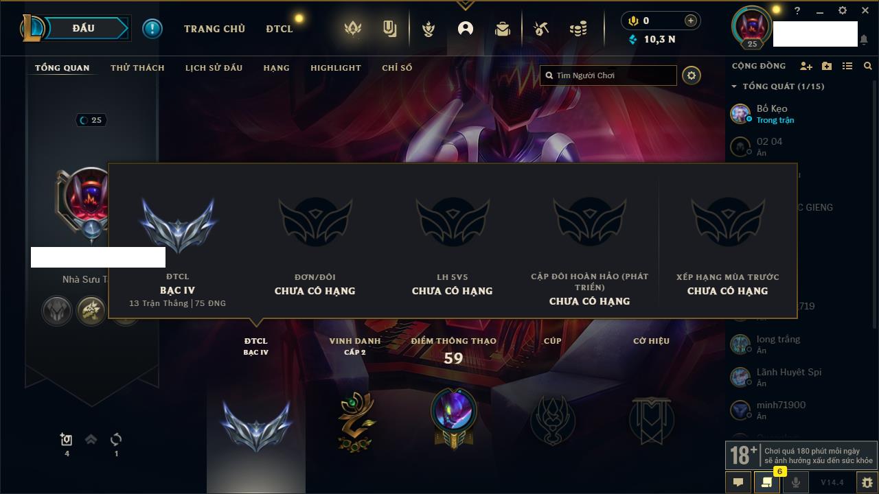 Rank Đơn: Vàng IIIKhung: VàngTướng: 77 - Còn 21172 THXTrang Phục: 8Rank ĐTCL: Kim Cương IIILinh Thú: 23