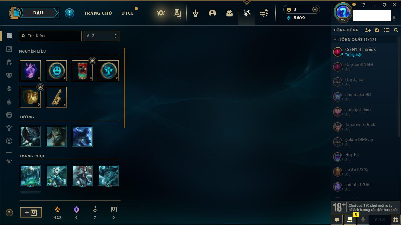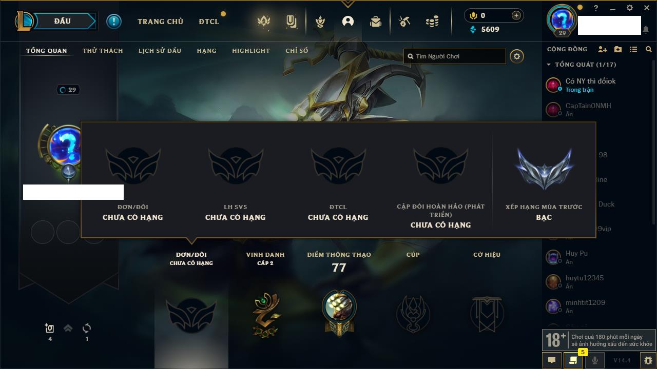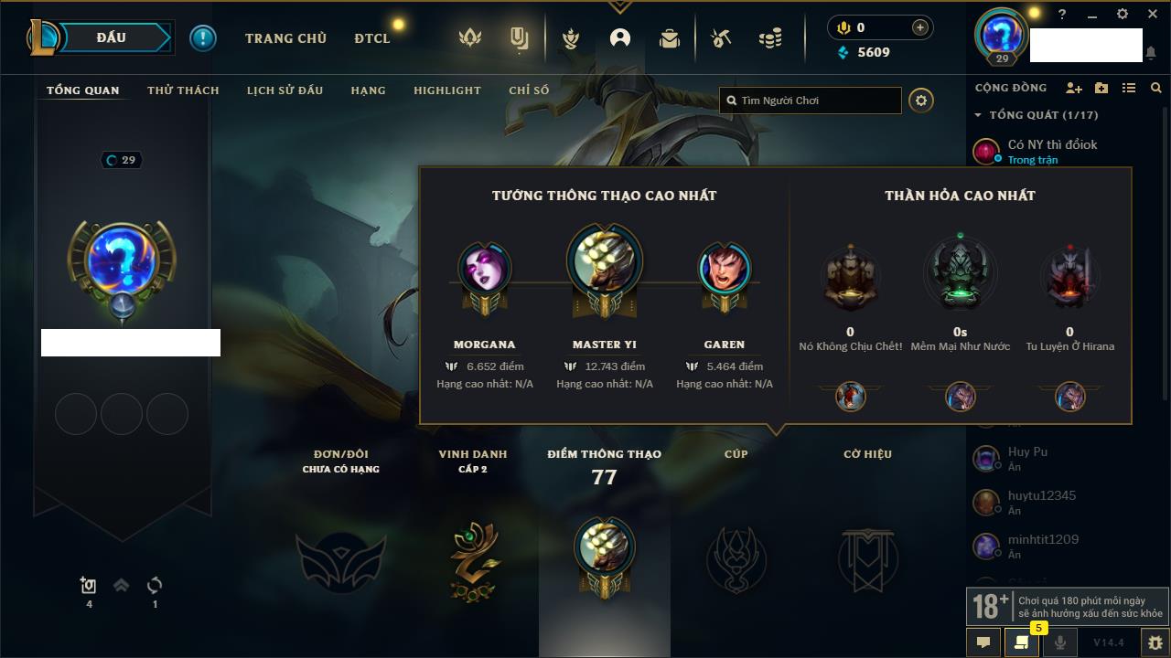 Rank Đơn: Vàng IIIKhung: VàngTướng: 77 - Còn 21172 THXTrang Phục: 8Rank ĐTCL: Kim Cương IIILinh Thú: 23