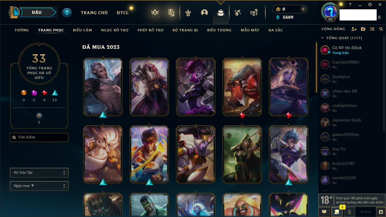 Rank Đơn: Chưa rank mùa nàoKhung: Chưa có khungTướng: 108 - Còn 6515 THXTrang Phục: 23Rank ĐTCL: Chưa RankLinh Thú: 111