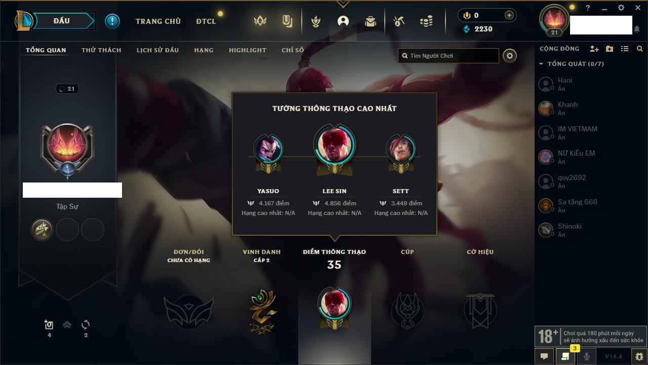 Rank Đơn: Sắt IIIKhung: Chưa có khungTướng: 88 - Còn 1376 THXTrang Phục: 12Rank ĐTCL: Bạc IVLinh Thú: 69