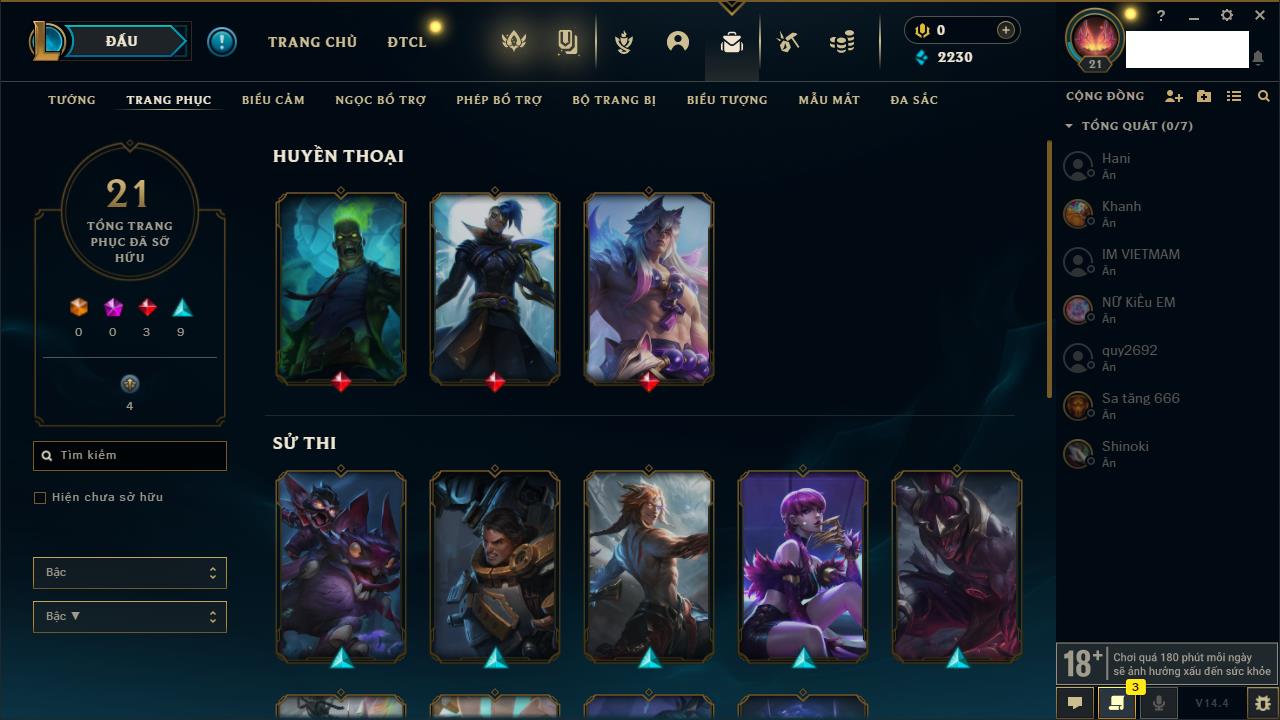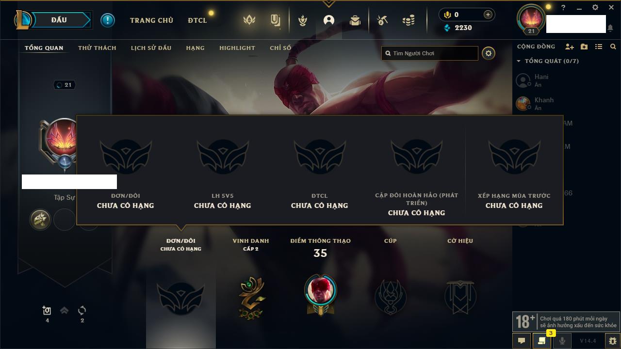 Rank Đơn: Đồng IIIKhung: Chưa có khungTướng: 86 - Còn 14367 THXTrang Phục: 19Rank ĐTCL: Vàng IIILinh Thú: 95