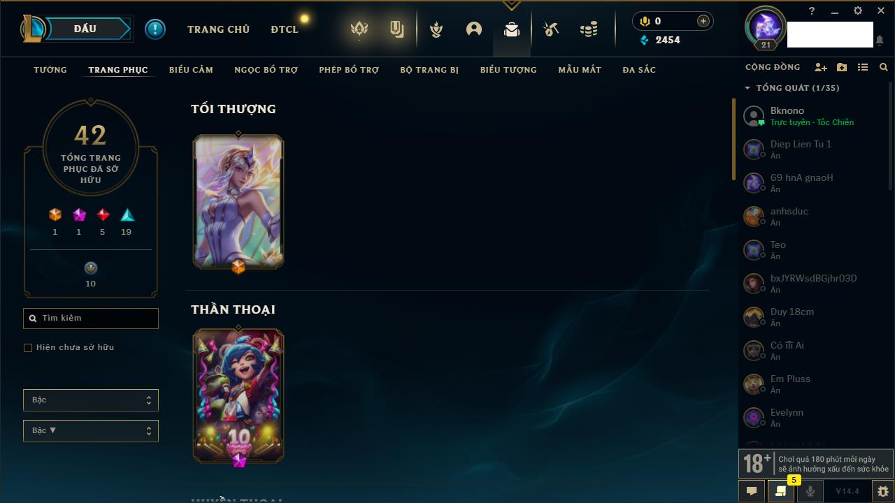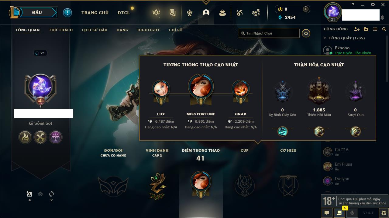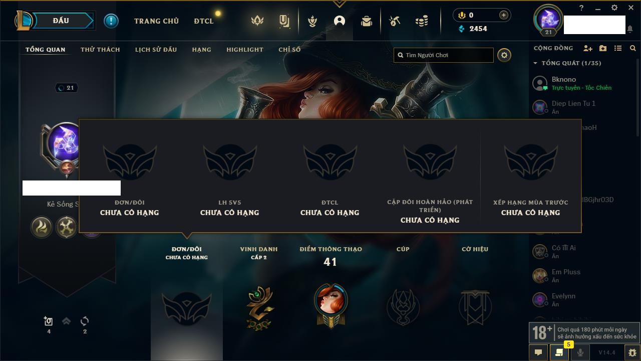 Rank Đơn: Đồng IIIKhung: Chưa có khungTướng: 86 - Còn 14367 THXTrang Phục: 19Rank ĐTCL: Vàng IIILinh Thú: 95