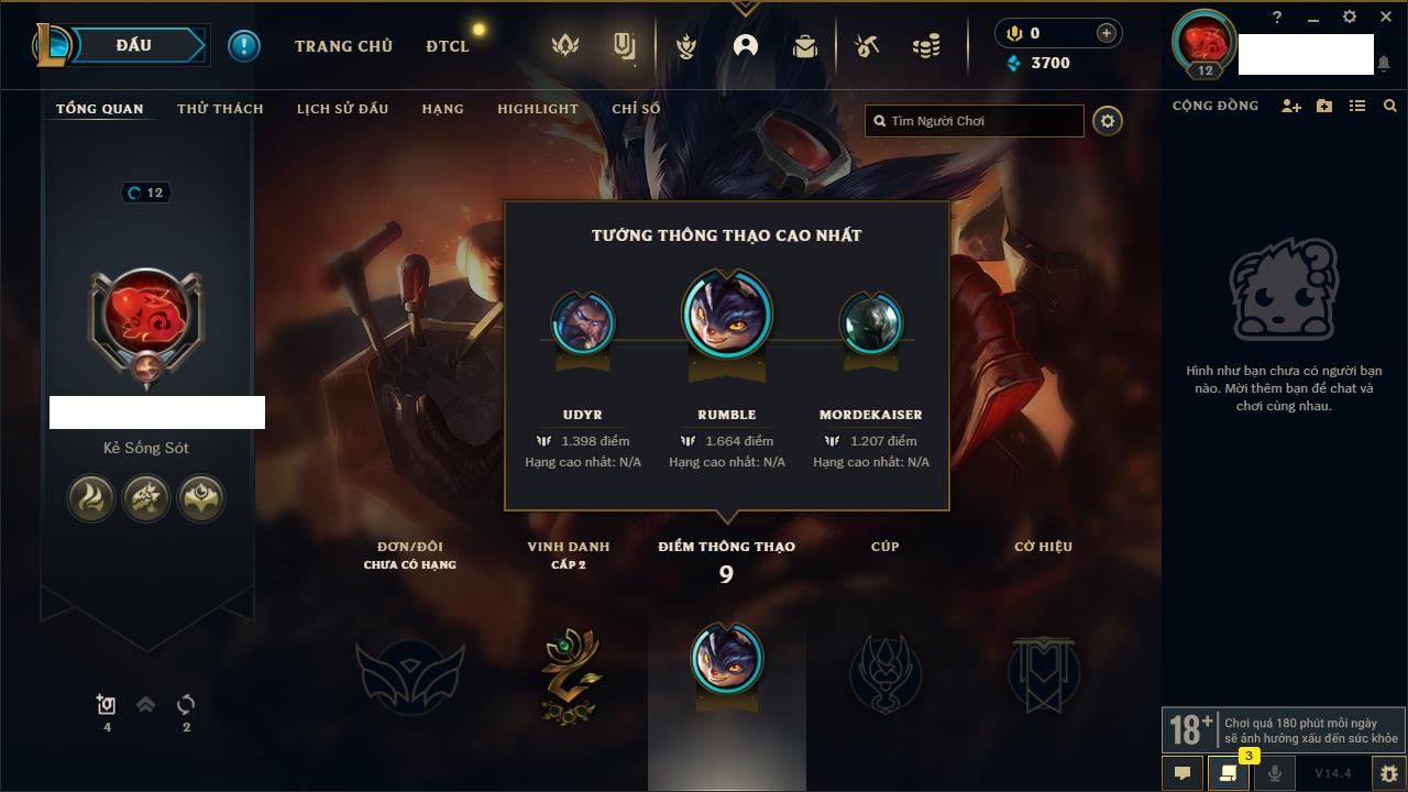 Rank Đơn: Chưa RankKhung: Chưa có khungTướng: 1 - Còn 3700 THXTrang Phục: 0Rank ĐTCL: Chưa RankLinh Thú: 11