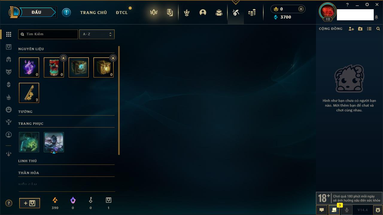 Rank Đơn: Chưa RankKhung: Chưa có khungTướng: 79 - Còn 2490 THXTrang Phục: 2Rank ĐTCL: Chưa RankLinh Thú: 26