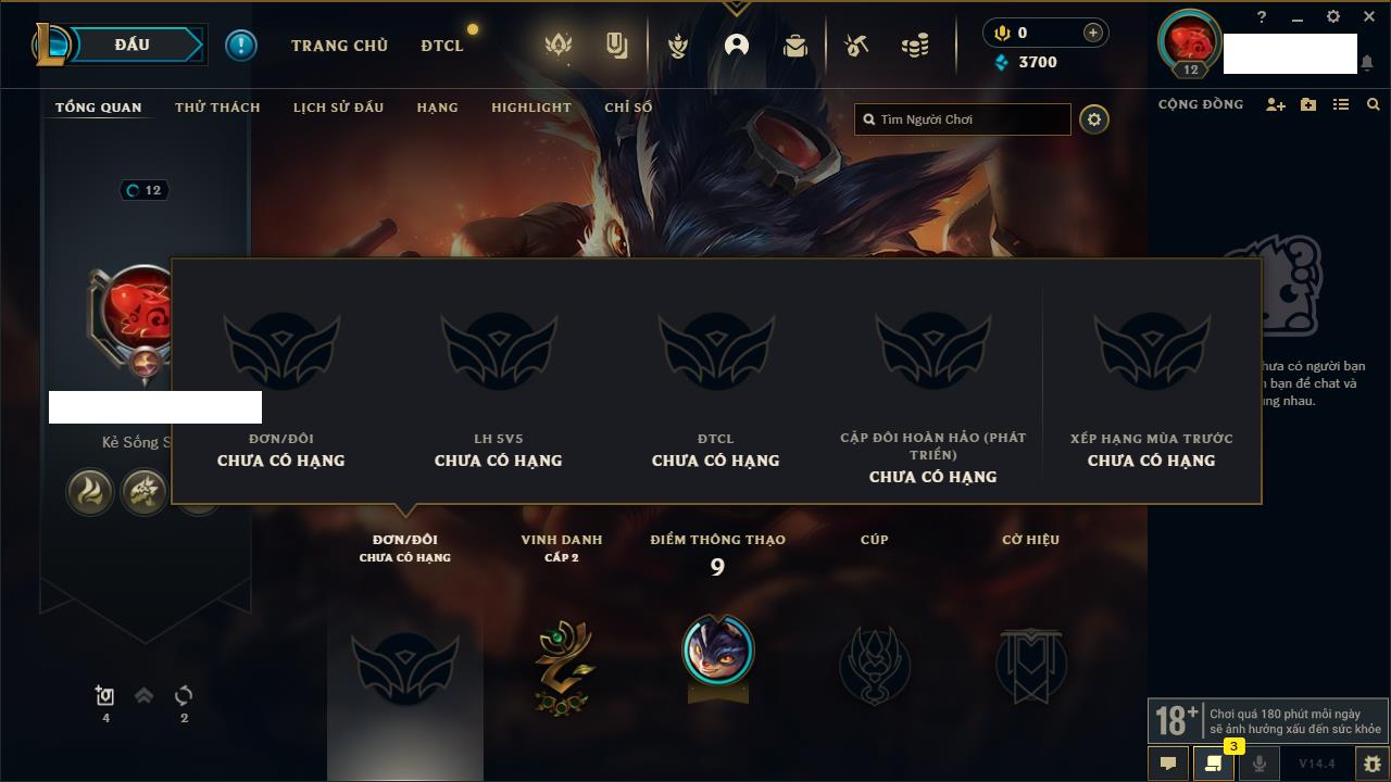 Rank Đơn: Chưa RankKhung: Chưa có khungTướng: 3 - Còn 34550 THXTrang Phục: 0Rank ĐTCL: Chưa RankLinh Thú: 41