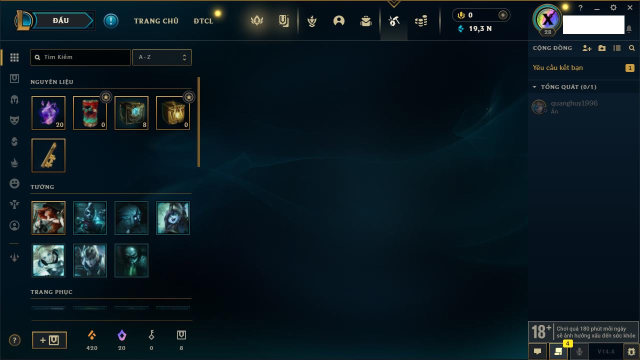 Rank Đơn: Chưa RankKhung: Chưa có khungTướng: 27 - Còn 170 THXTrang Phục: 0Rank ĐTCL: Chưa RankLinh Thú: 33