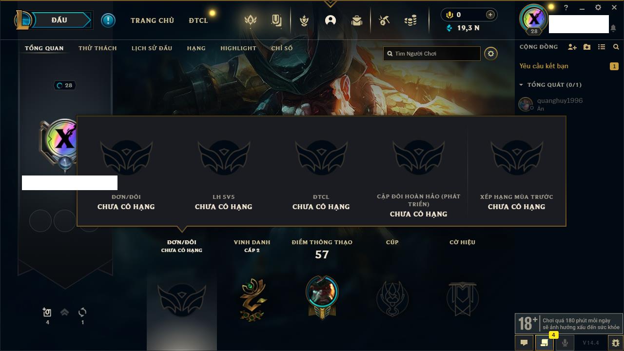 Rank Đơn: Chưa RankKhung: Chưa có khungTướng: 0 - Còn 0 THXTrang Phục: 0Rank ĐTCL: Chưa RankLinh Thú: 13
